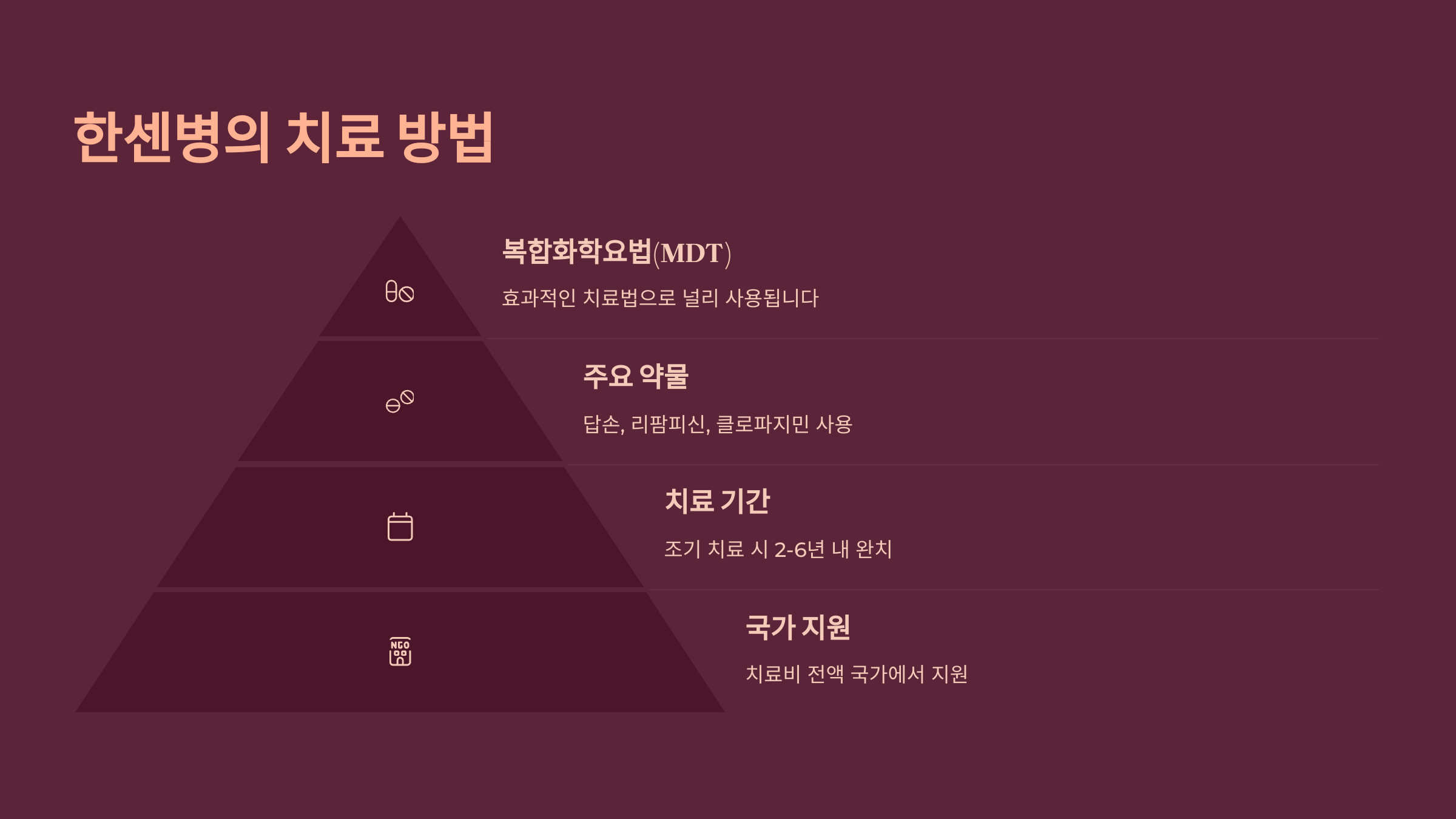 다행히도 한센병은 치료제가 있어요. 다제치료(MDT)라는 항생제 복합 요법으로 치료하며, 6개월에서 1년 정도의 기간이 필요해요. 전염성도 치료가 시작되면 급격히 떨어지기 때문에, 격리 조치도 과거처럼 필요하지 않아요.
