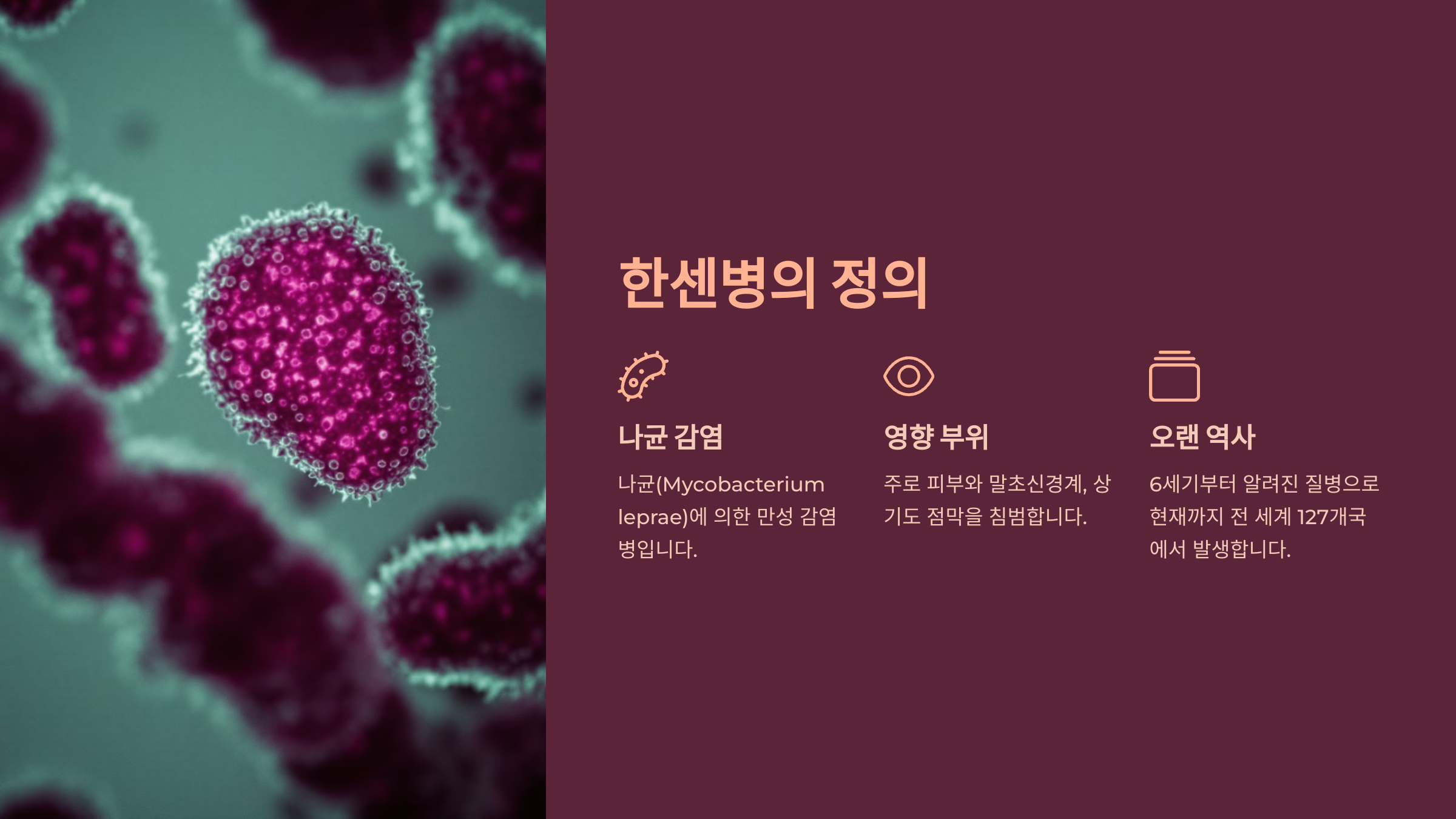 한센병은 한때 '나병'으로 불리며 사회적으로도 큰 두려움의 대상이었던 병이에요. 이 병은 신경과 피부에 서서히 영향을 주는 만성 감염 질환으로, 조기에 발견하지 않으면 돌이킬 수 없는 손상으로 이어질 수 있답니다. 요즘은 치료도 가능하고 전염성도 낮지만, 여전히 조기 진단이 무엇보다 중요해요.