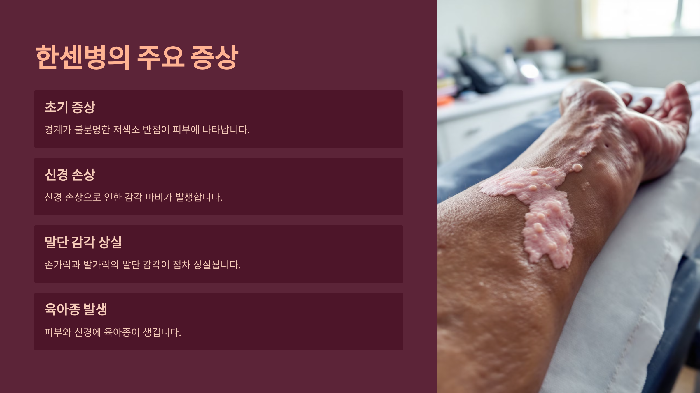 한센병은 주로 피부와 말초 신경을 공격해요. 이 병균은 증식 속도가 매우 느리기 때문에 증상이 나타나는 데 수년이 걸릴 수도 있어요. 이런 특성 때문에 조기 발견이 어려운 경우가 많고, 초기에 감기처럼 가볍게 생각되기 쉽죠. 하지만 방치하면 신체 일부가 마비되거나, 심하면 조직이 괴사할 수도 있어요.