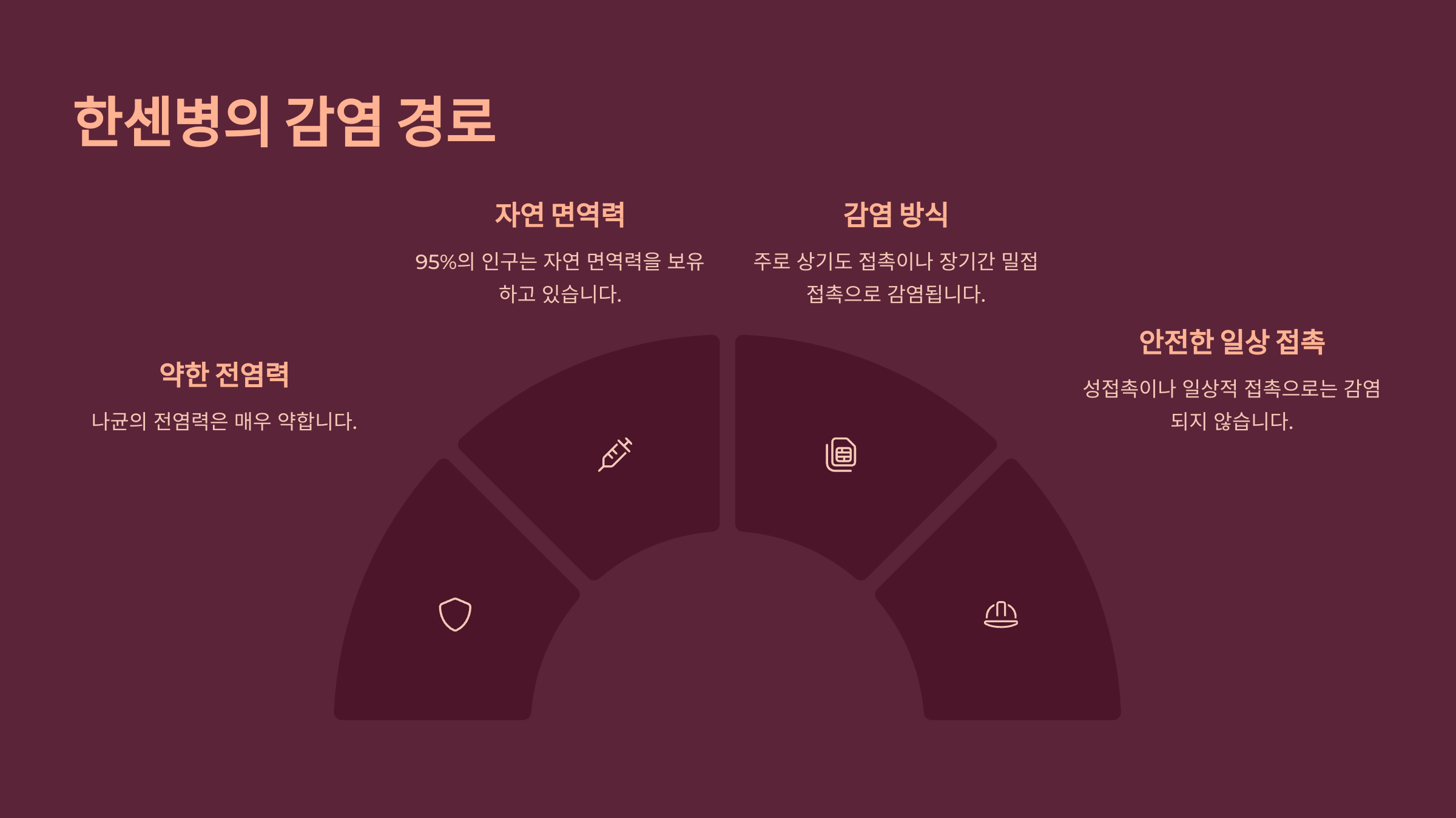 한센병의 감염 경로는 주로 장기간의 밀접 접촉에서 발생하므로, 사회적 거리두기와 개인 위생 관리의 중요성이 강조되어요.