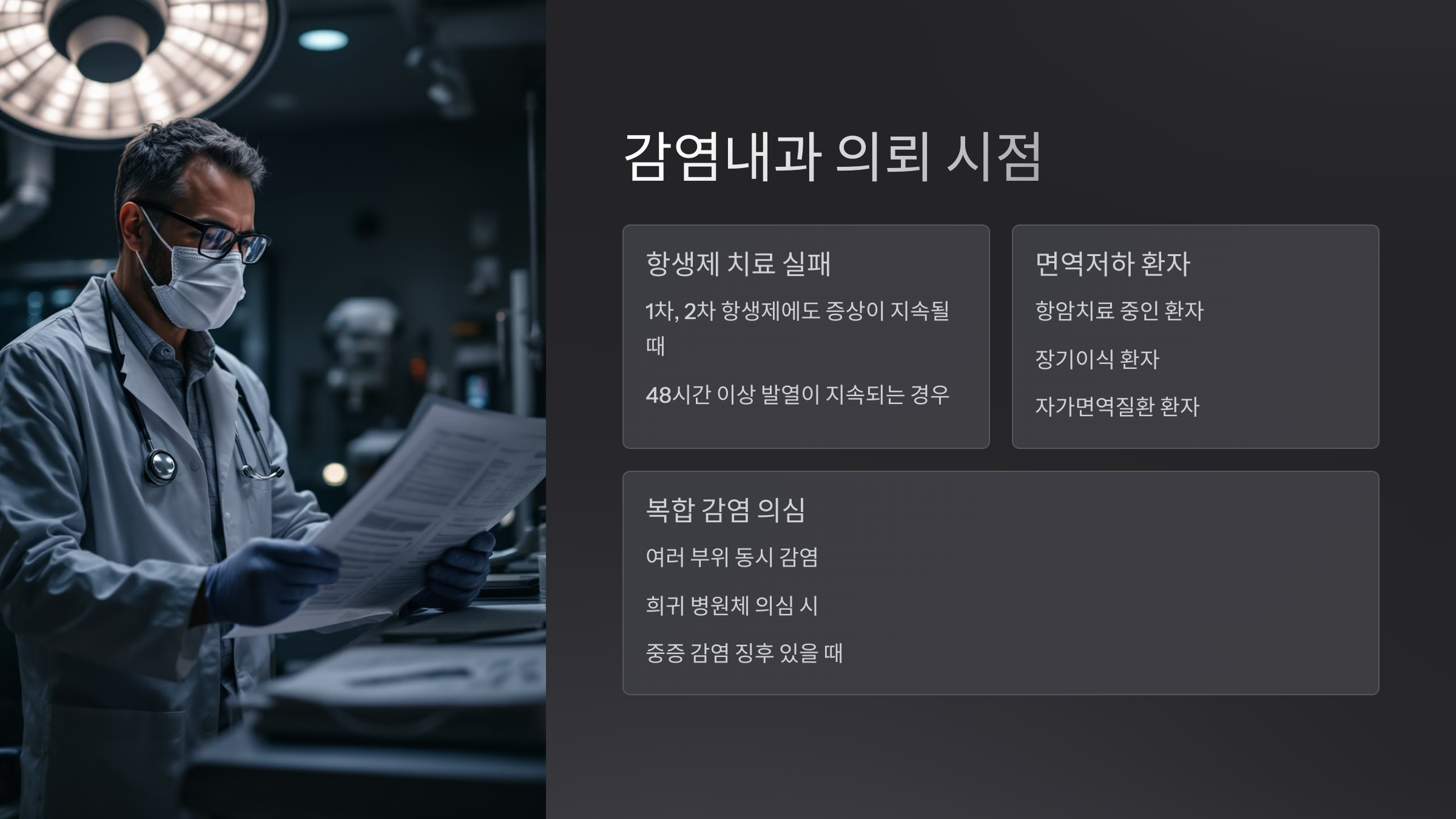 특히 반복적인 감염, 여러 차례 항생제 치료에도 균이 사라지지 않는 경우, 드물거나 복합 감염이 의심되는 경우에는 감염내과에 꼭 의뢰해야 해요. 대학병원 감염내과 외래에서 자세한 상담을 받을 수 있어요.