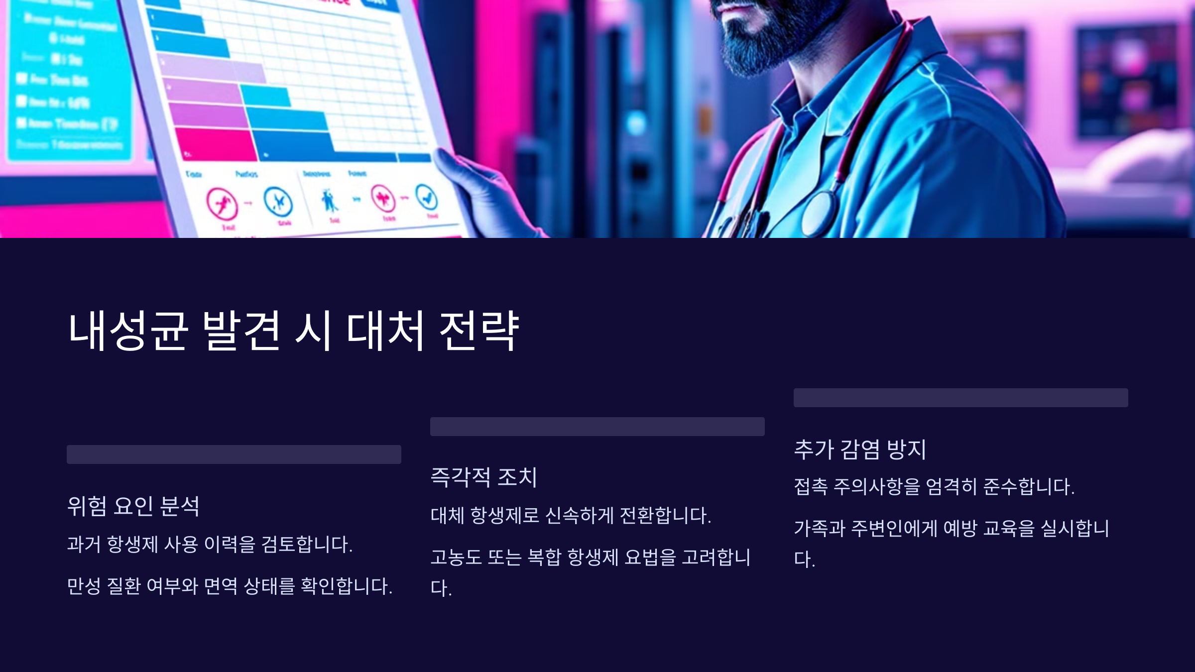 항생제 감수성 검사 결과에서 ‘내성’이라고 표시되면 당황할 수 있어요. 하지만 걱정하지 말고 차근차근 대처하면 충분히 해결 가능하답니다. 먼저, 내성균이 발견되었을 때는 해당 항생제를 절대 사용하지 않아야 해요. 그 대신 감수성이 있는 다른 항생제로 치료 방향을 바꿔야 해요.
