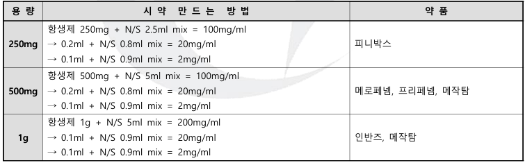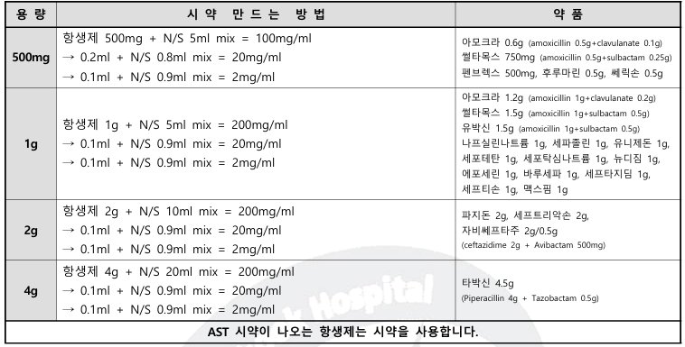 항생제 skin test 용 시약 만드는 방법 (기준 2mg/ml) : 0.02~0.05ml로 skin test 검사 실시