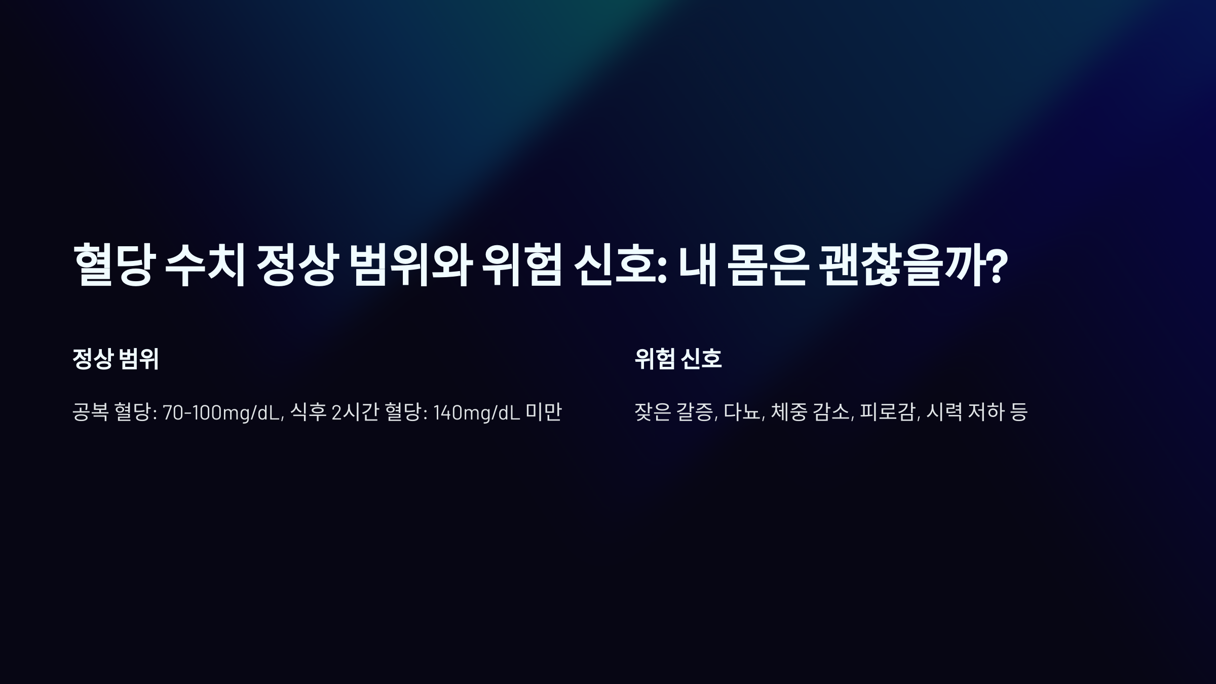 | 공복 혈당 | 70~99mg/dL | 100~125mg/dL | 126mg/dL 이상 |