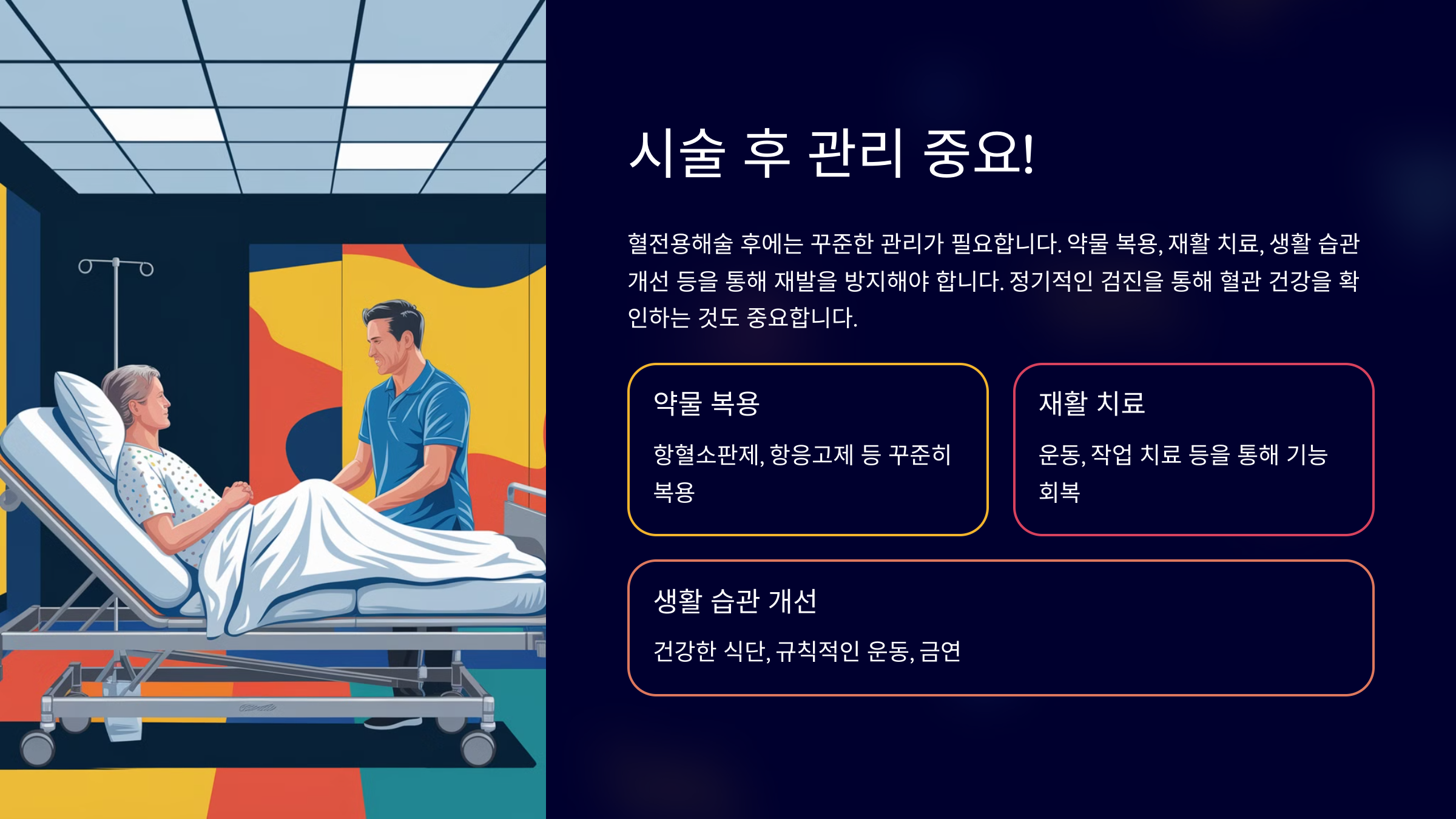 혈전용해술이 성공적으로 끝났다고 해도, 이후의 관리가 아주 중요해요. 치료 후 혈관이 다시 막히지 않도록 꾸준한 관리를 해야 해요. 회복 과정은 환자의 상태에 따라 다를 수 있지만, 일반적으로 다음과 같은 단계로 진행돼요.