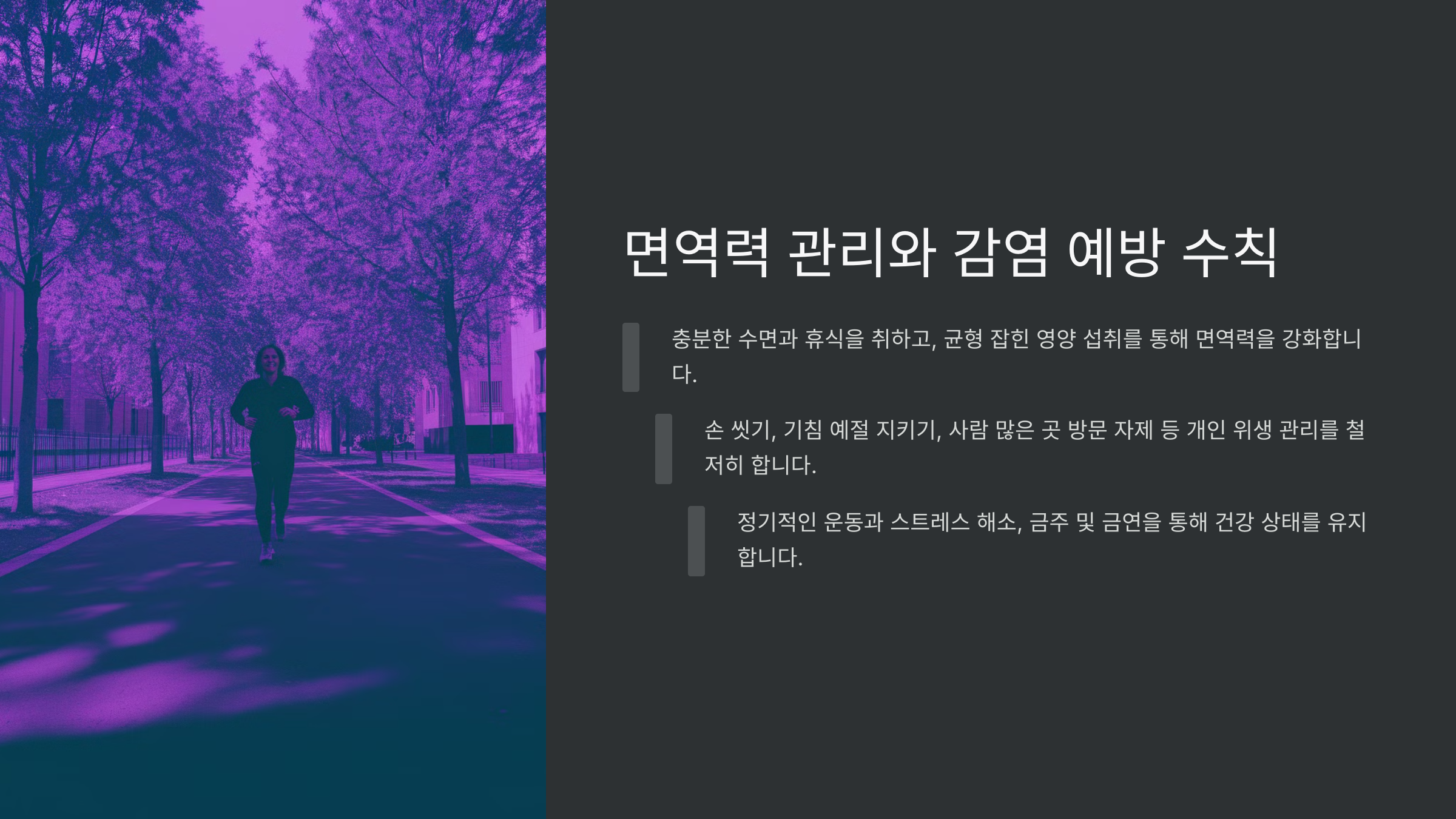 | 비타민 섭취 | 면역력 증진 (비타민 C, D 섭취) |
