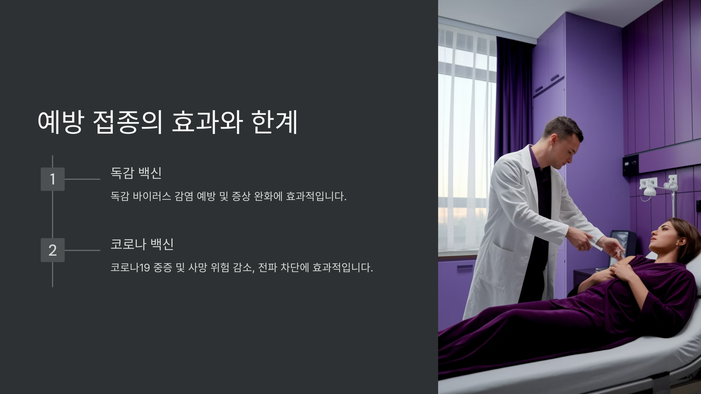 | 독감 백신 접종 | 독감 예방 효과, 동시 감염 위험 감소 |