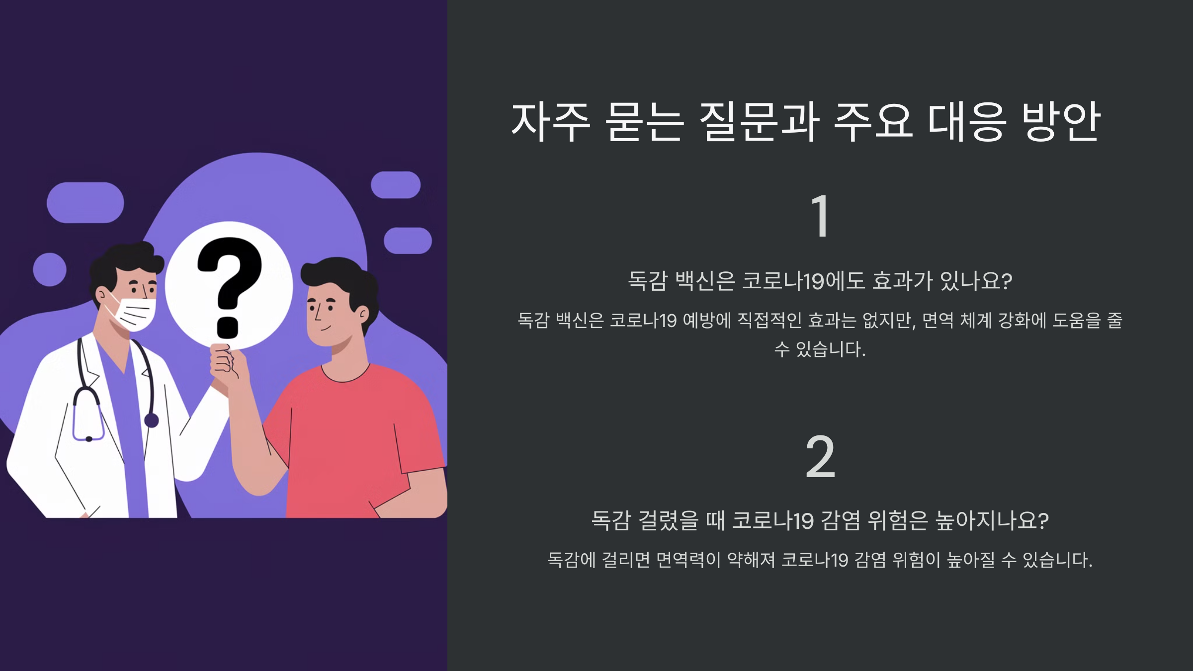 독감과 코로나에 대한 궁금증이 많을 텐데요. 가장 많이 묻는 질문을 FAQ에서 정리해봤어요! 🔍