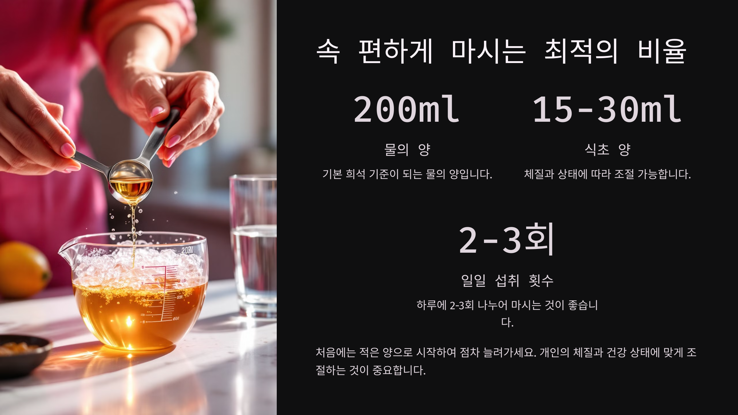 일반적으로 물 200~300ml에 사과초모식초 1~2스푼(약 10~15ml)을 섞는 것이 가장 이상적인 비율이에요. 너무 많이 넣으면 위산이 과다 분비될 수 있으니 주의해야 해요.