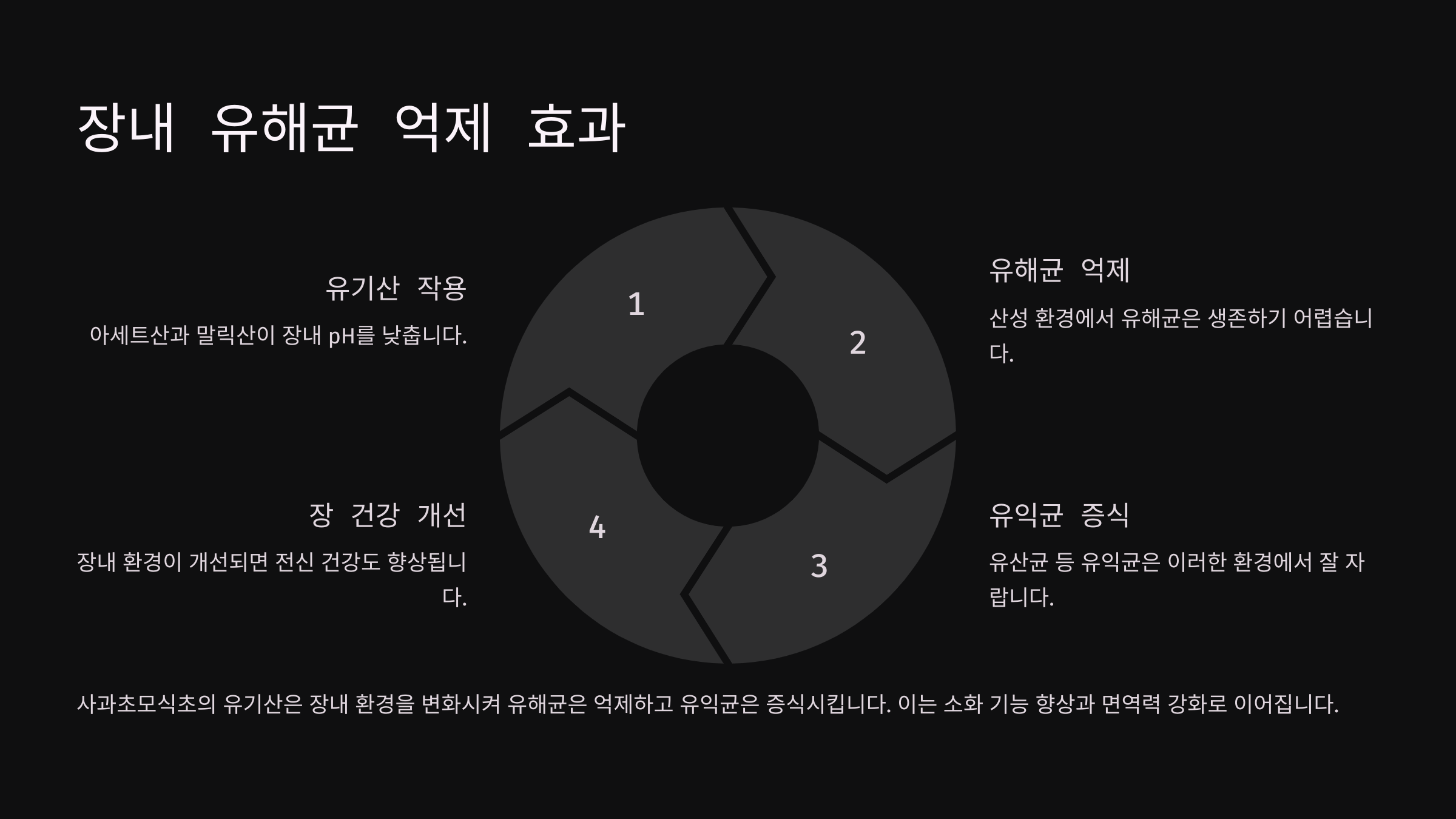사과초모식초의 핵심 성분인 아세트산과 폴리페놀은 유해균이 장내에서 번식하는 것을 막아줘요. 예를 들어, 대장균이나 헬리코박터 파일로리 같은 나쁜 균의 성장을 억제하는 연구 결과도 있답니다.