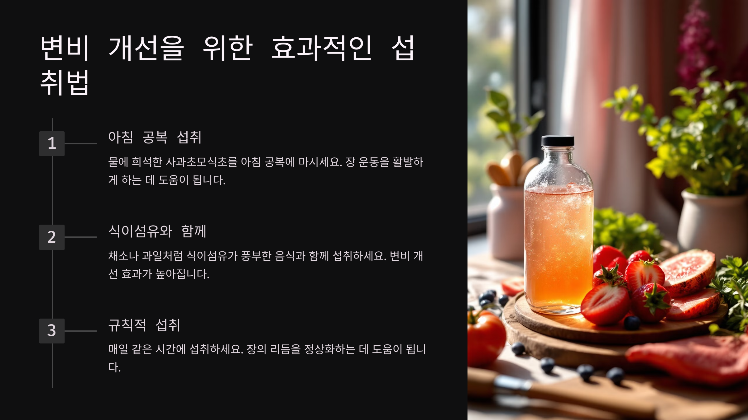 변비 개선을 위해서는 아침 공복에 미지근한 물 한 잔에 사과초모식초를 1~2스푼 섞어 마시는 게 좋아요. 여기에 치아씨드나 레몬즙을 추가하면 효과가 더 좋아질 수 있어요! 🍋