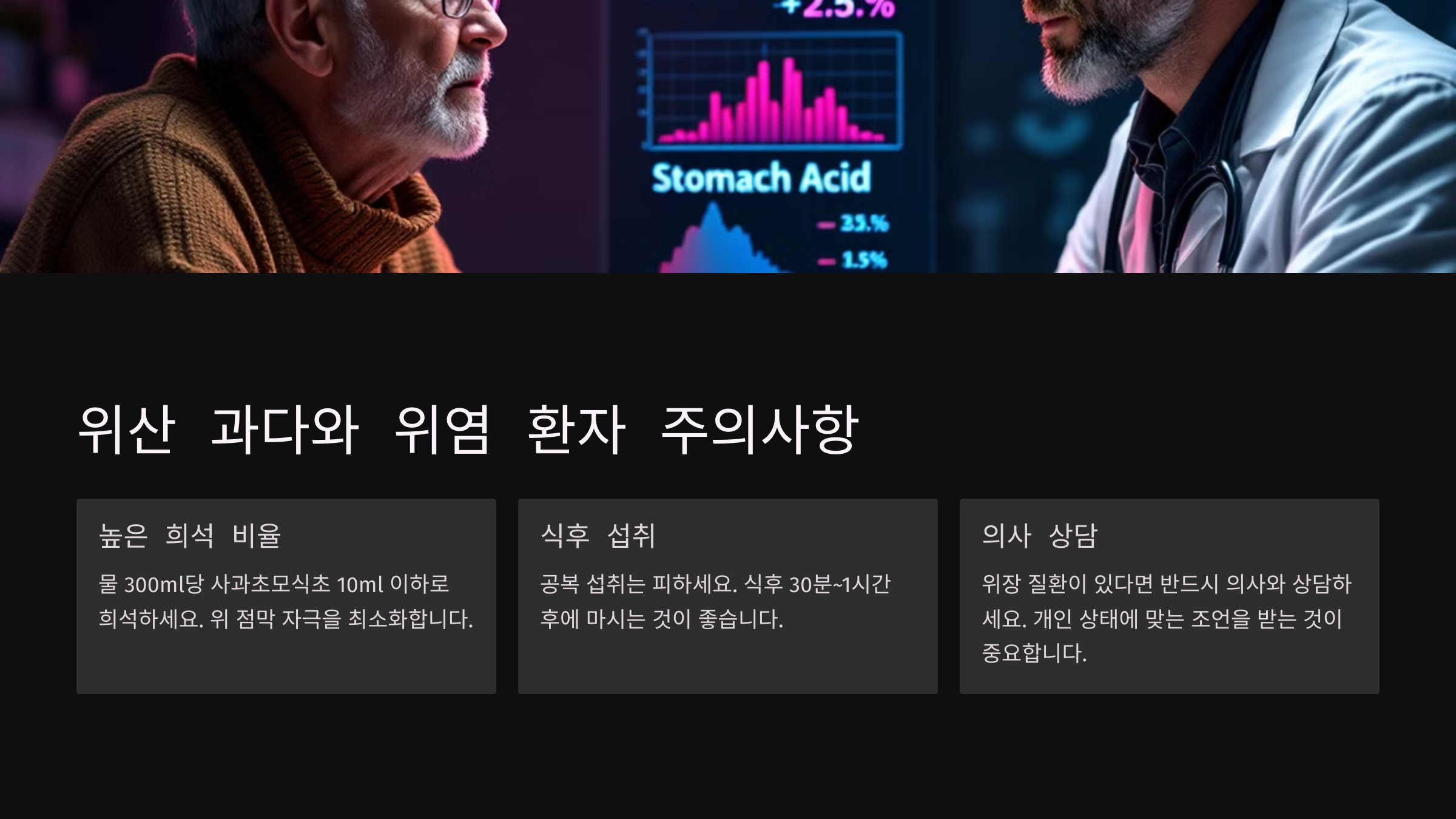 또한, 위염이 있는 사람은 사과초모식초를 식사와 함께 섭취하는 것이 좋아요. 식사 중간이나 식후에 마시면 위에 부담을 줄이고 속이 편안해질 수 있어요. 😉
