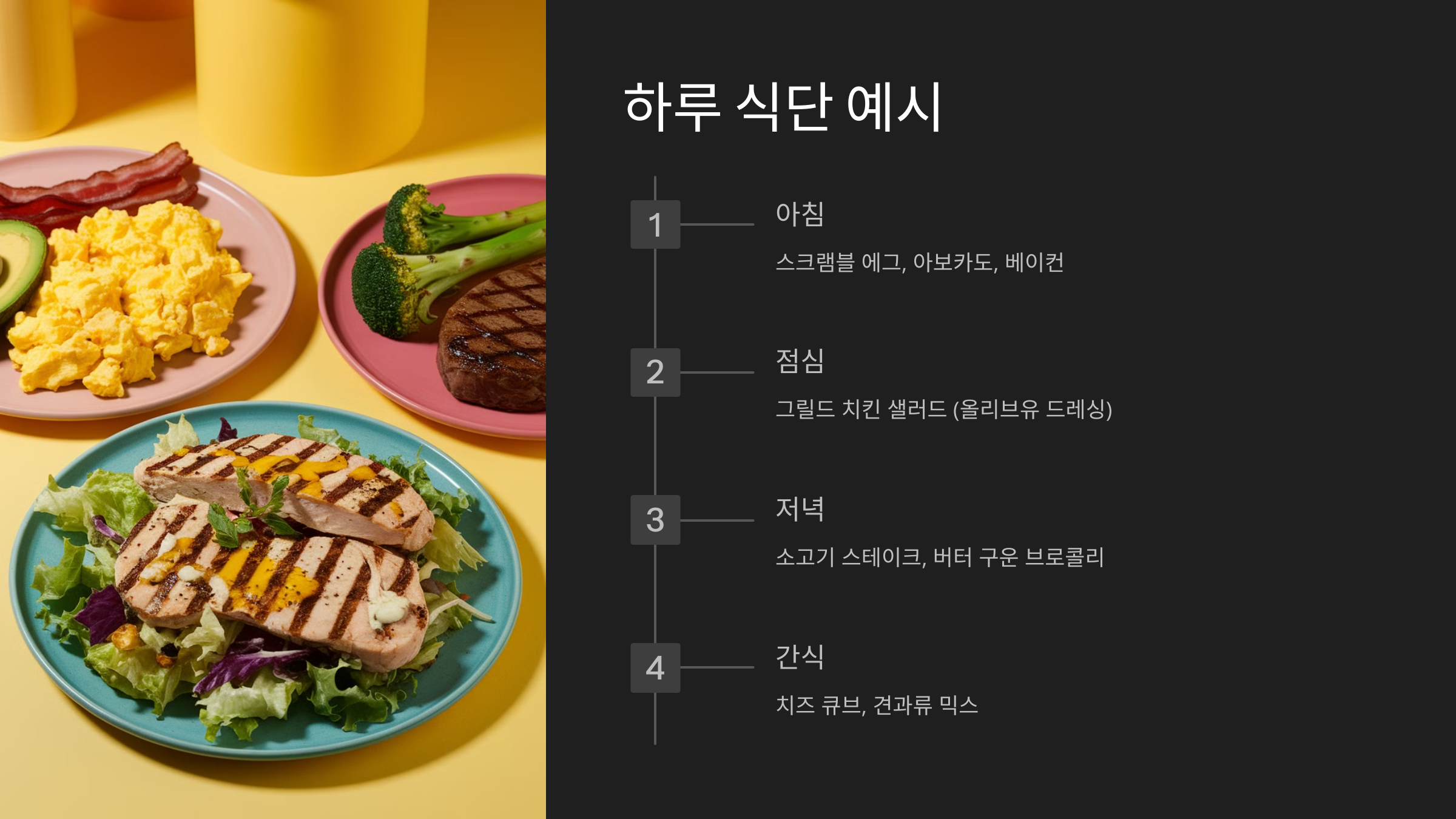 저탄고지 식단을 실천하려면 하루 식단을 체계적으로 구성하는 것이 중요해요! 😃 하루 동안 탄수화물 섭취를 최소화하면서도 영양소 균형을 맞춘 예시를 준비했어요.