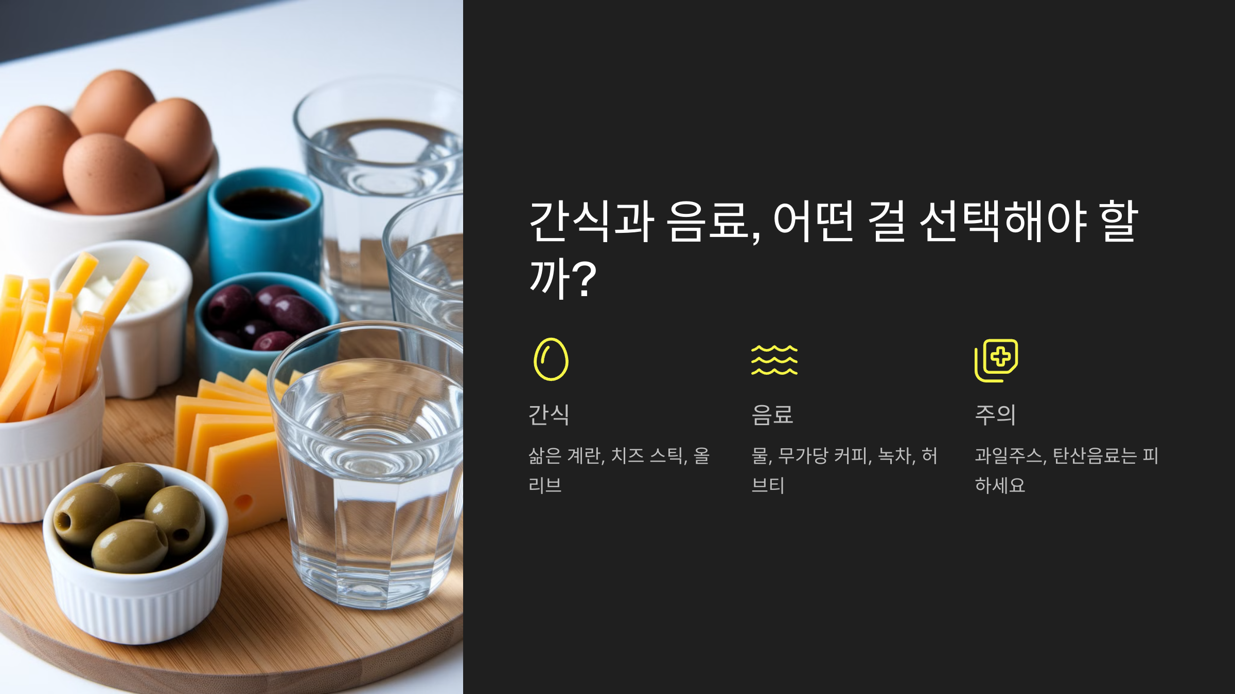 저탄고지 식단을 하다 보면 가끔 출출할 때가 있어요. 하지만 일반적인 간식은 대부분 탄수화물이 많아서 주의해야 해요! 😵💫 그렇다면 저탄고지에 맞는 간식과 음료는 무엇이 있을까요? 🍫🥑