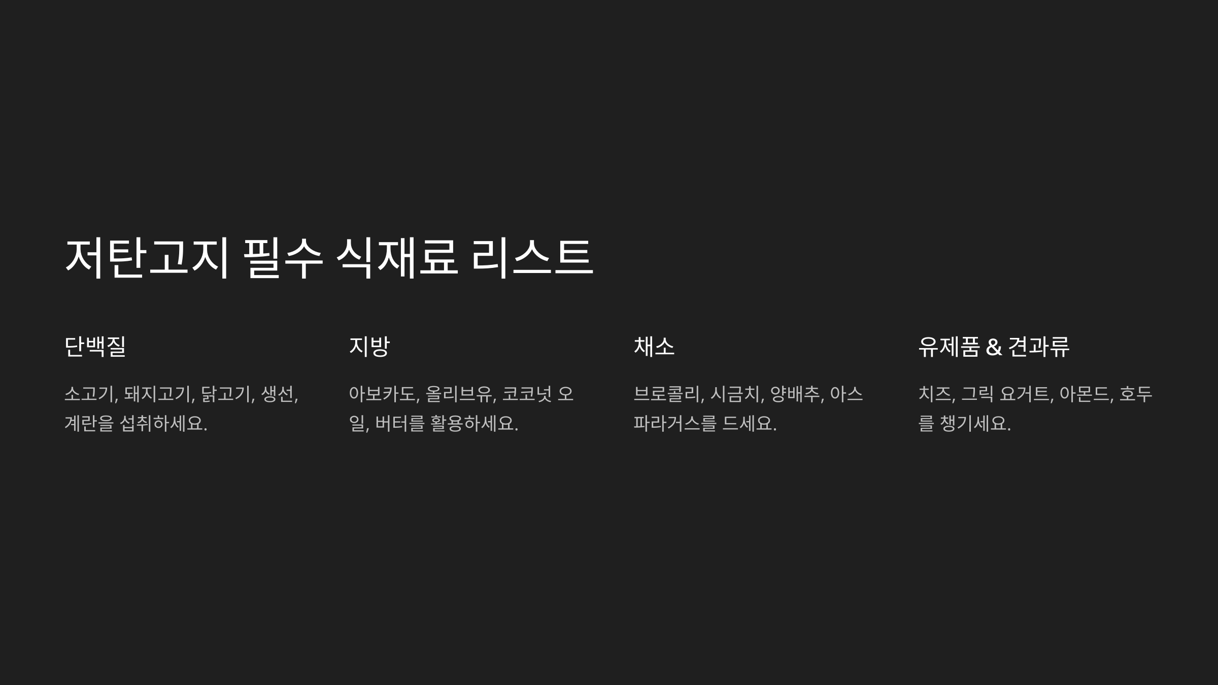이제 저탄고지 식단에서 어떤 재료를 선택해야 할지 감이 오셨죠? 😊