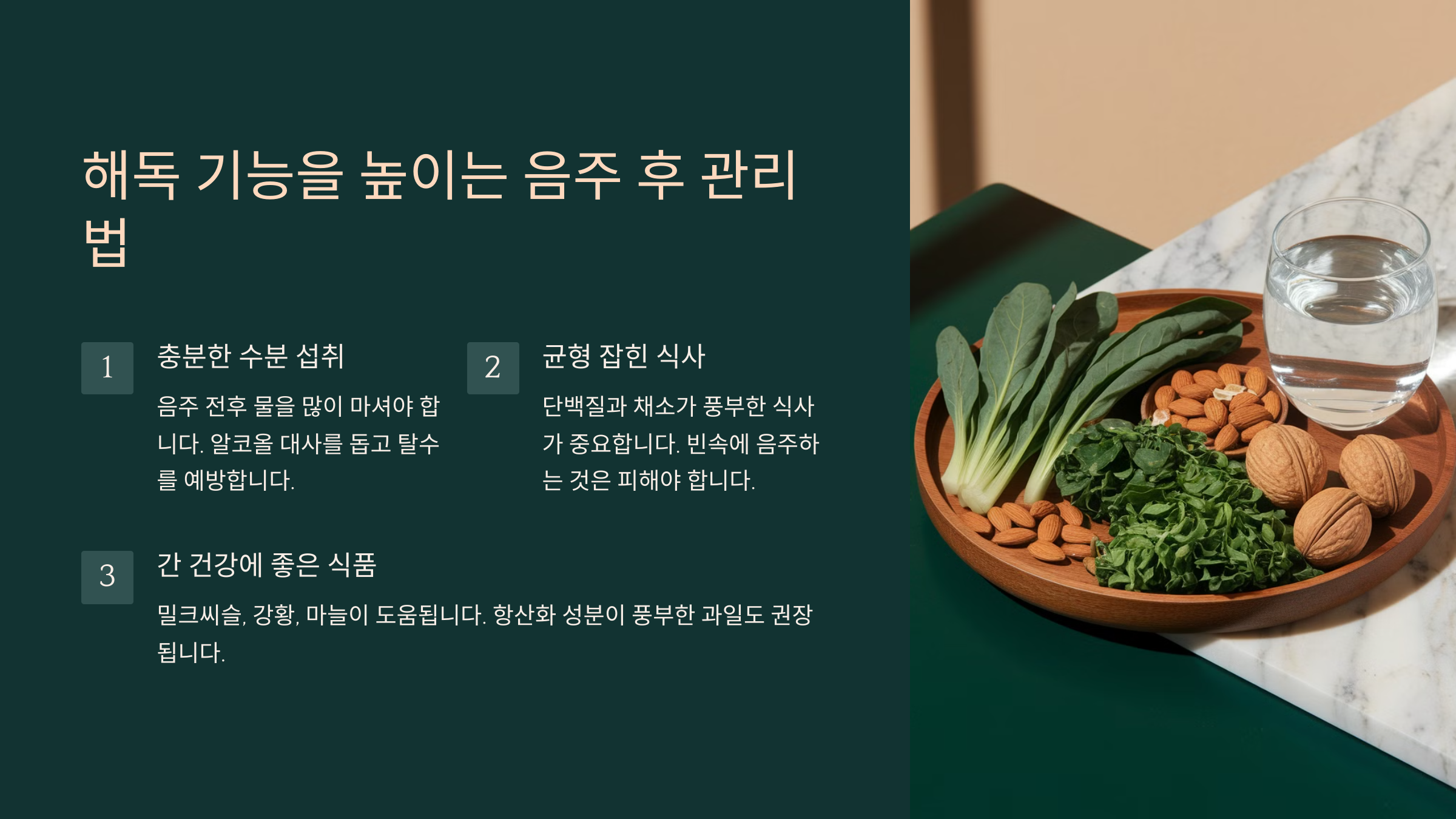 술을 마신 후 간은 알코올을 분해하는데 집중해야 해요. 이 과정에서 아세트알데하이드라는 독성 물질이 생성되는데, 이것이 분해되지 않고 남으면 숙취와 간 손상의 원인이 돼요. 따라서 음주 후에는 간 해독을 돕는 음식과 습관이 중요해요. 🍊