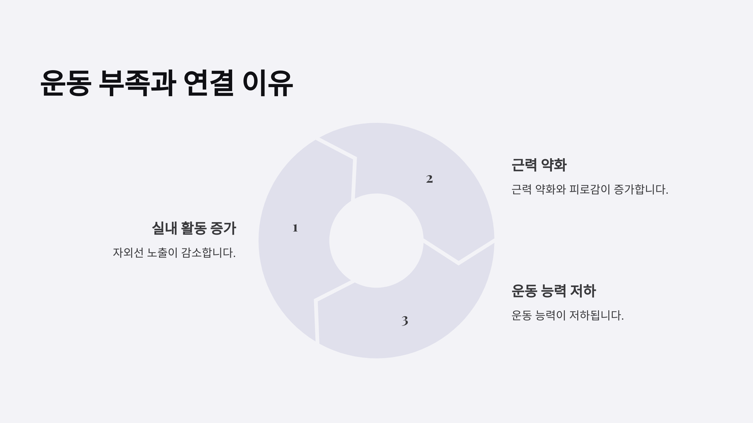 비타민D는 뼈 건강뿐만 아니라 근육 기능과도 밀접한 관련이 있어요. 비타민D가 부족하면 근육의 힘이 약해지고, 쉽게 피로를 느끼게 돼요. 이런 상태가 지속되면 운동을 하기 어려워지고, 점점 활동량이 줄어드는 악순환이 발생해요.