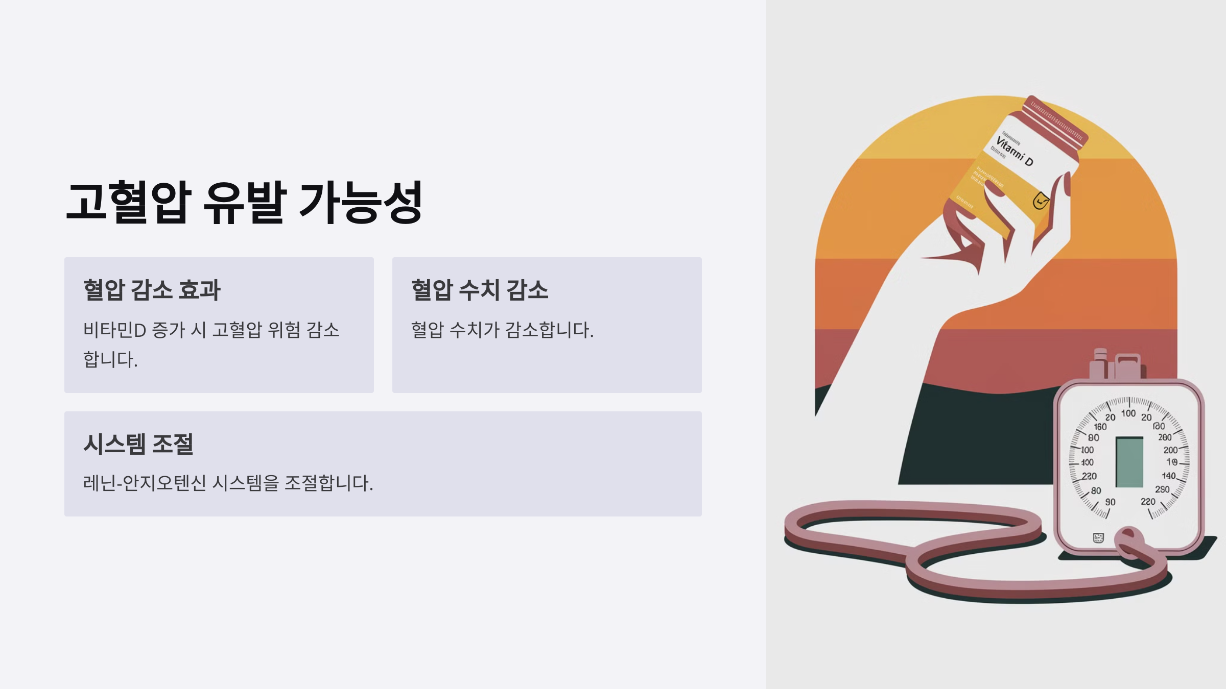 비타민D는 혈관을 확장시키고 염증을 줄이는 역할을 해요. 하지만 비타민D가 부족하면 혈관이 수축되고 혈압이 상승할 가능성이 높아져요. 실제로 비타민D가 낮은 사람들은 고혈압 위험이 30~50% 증가한다는 연구 결과도 있어요.