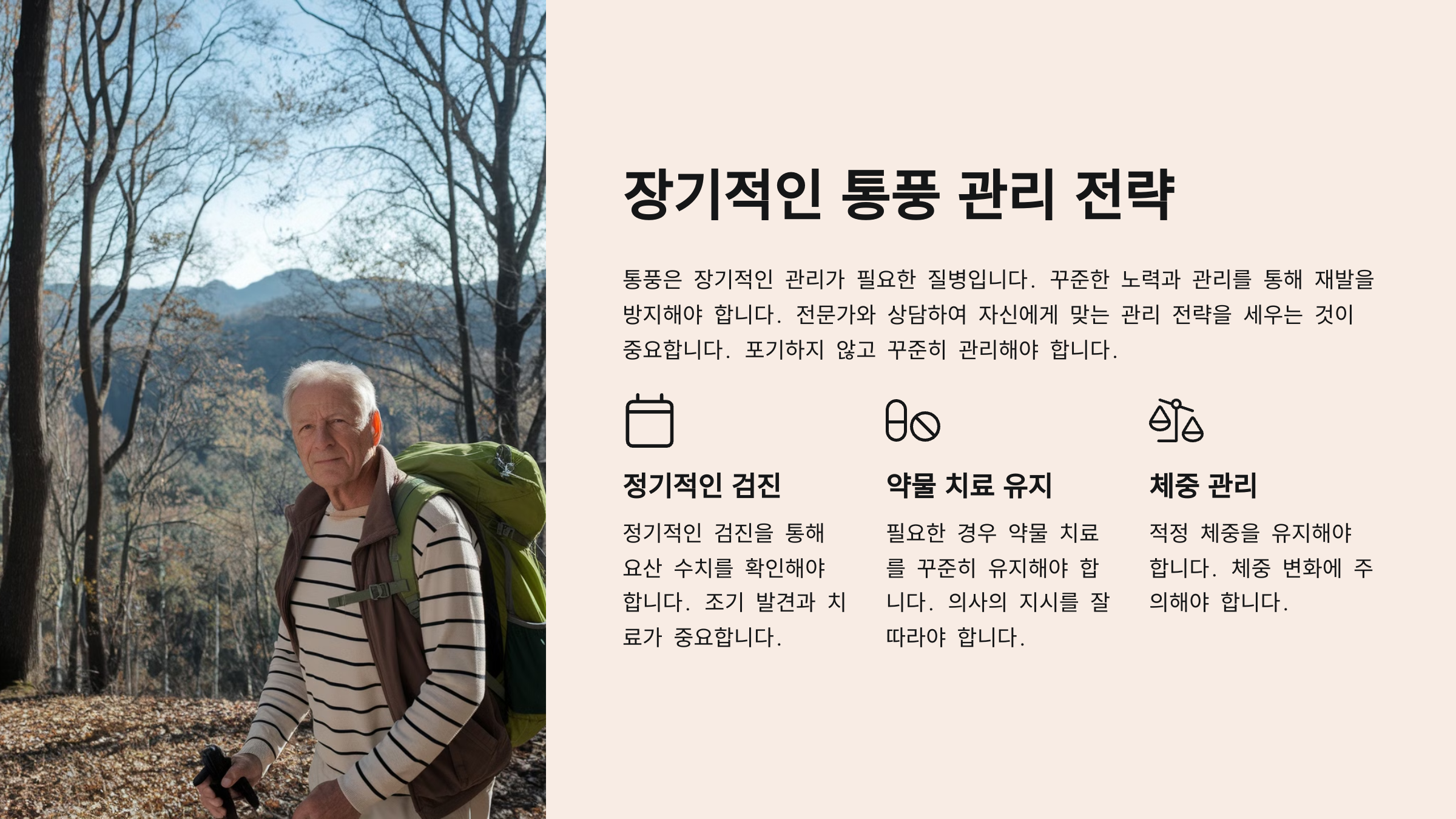 통풍은 철저한 관리만 있다면 충분히 예방할 수 있어요! 생활 습관을 개선하여 **건강하고 활기찬 삶을 유지해 보세요.** 😊