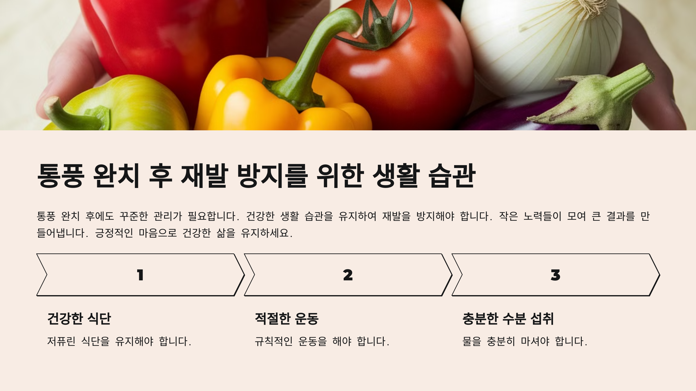 이처럼 **꾸준한 관리와 실천이 통풍 완치의 핵심**이에요! 통풍으로 고민하고 있다면, 위 사례를 참고해 본인의 상황에 맞는 방법을 적용해 보세요. 💪