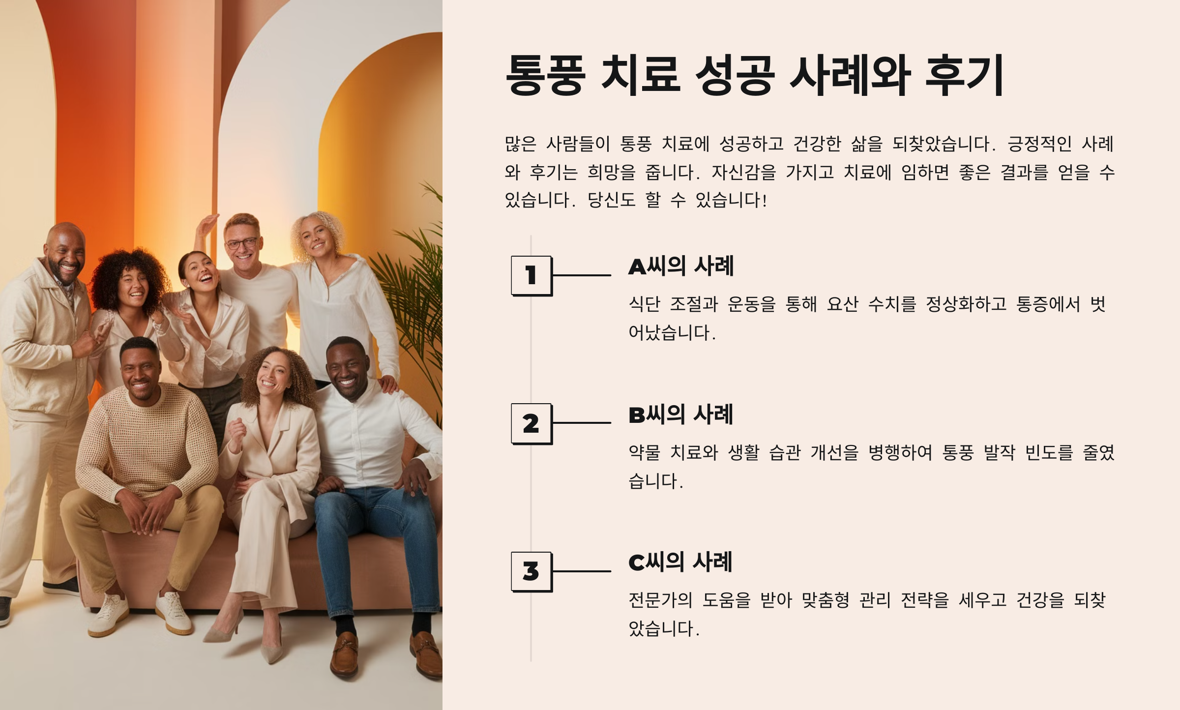 ✔️ **사례 1: 40대 직장인의 완치 경험** 김민수(가명) 씨는 3년 전부터 통풍으로 고생했어요. 발작이 반복되면서 걷기도 어려울 정도였지만, **식습관 개선과 꾸준한 운동, 요산 강하제 복용을 병행**하면서 건강을 회복했어요. 현재는 요산 수치를 정상 범위로 유지하고 있으며, 더 이상 통증이 발생하지 않고 있어요.