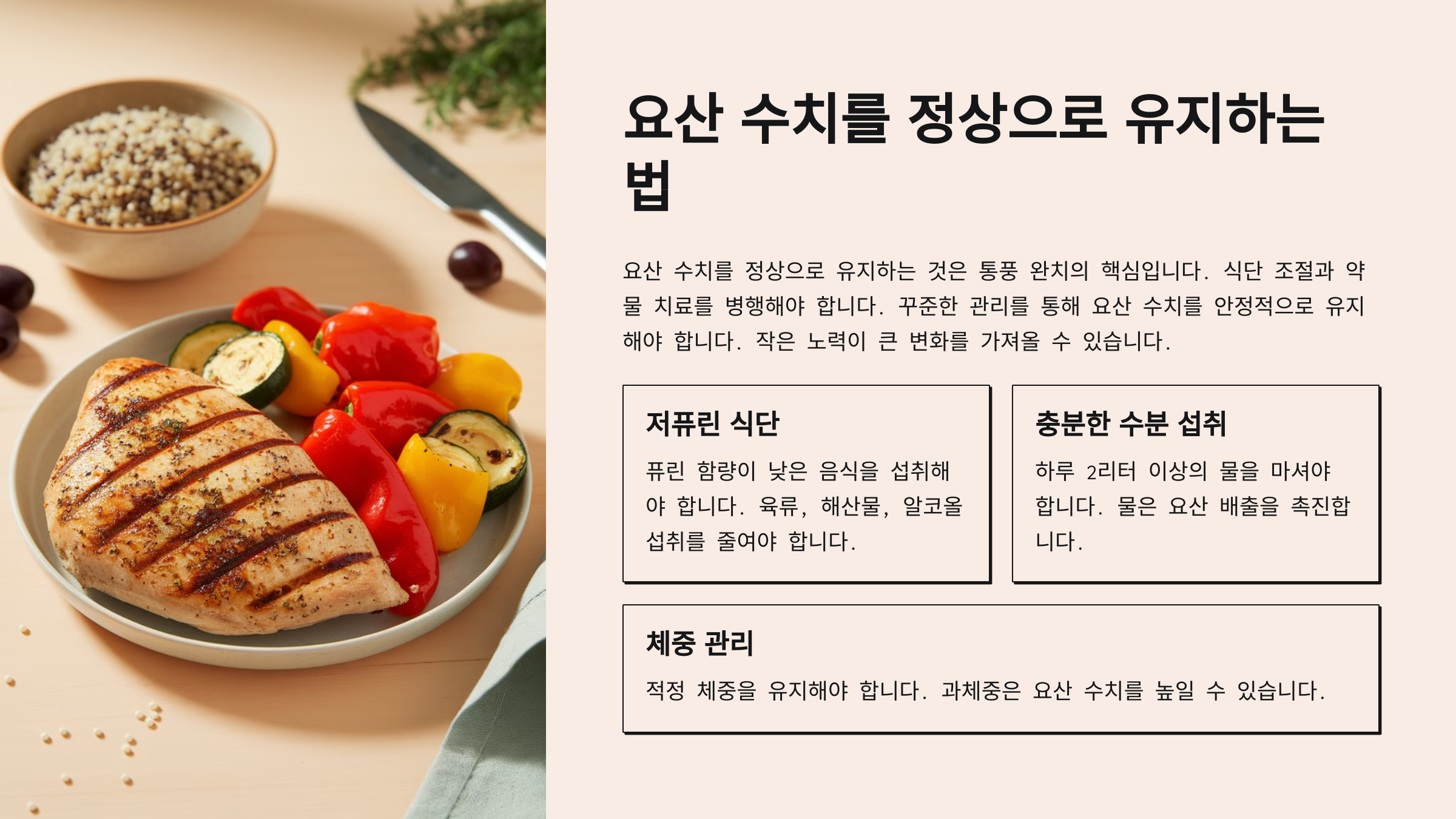 1️⃣ **식습관 개선**: 퓨린이 많이 함유된 음식(붉은 고기, 내장류, 해산물, 맥주 등)은 피하고, 저퓨린 식단을 유지하는 것이 중요해요. 대신 채소, 통곡물, 저지방 유제품을 섭취하면 도움이 돼요.