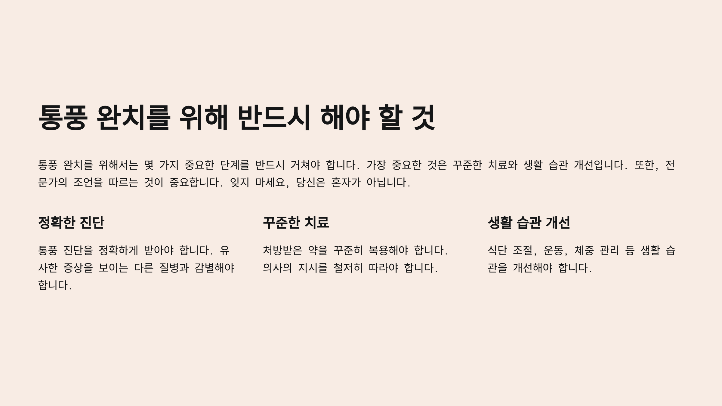 전문가들이 강조하는 **“꾸준한 관리”**가 통풍 완치의 핵심이에요! 정확한 정보를 바탕으로 건강한 생활을 실천해 보세요. 💪