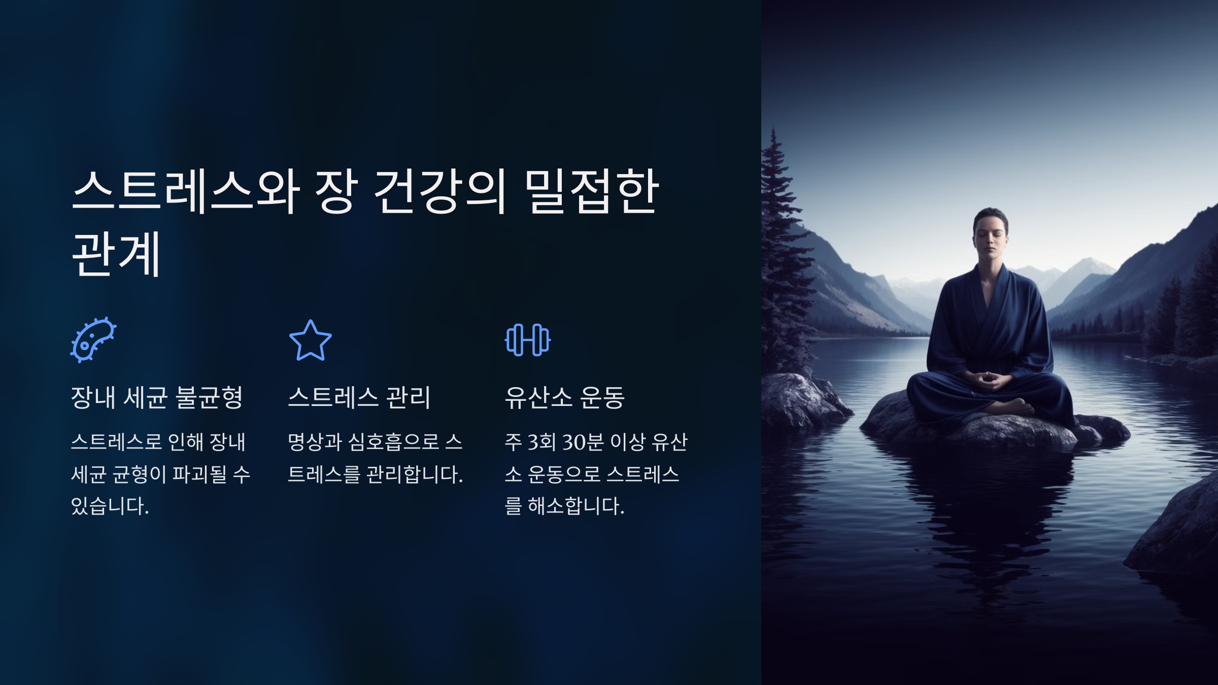 | 명상 & 심호흡 | 하루 10분 조용히 호흡 조절 | 장 운동 안정화 |