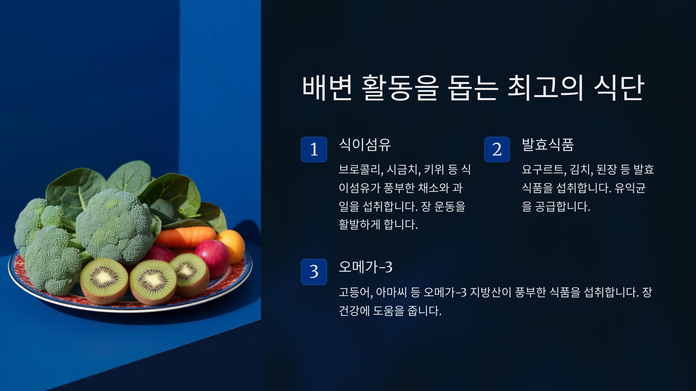 장 건강을 위해서는 무엇을 먹느냐가 정말 중요해요. 변비 없이 원활한 배변 활동을 위해서는 식이섬유가 풍부한 음식과 장내 유익균을 증가시키는 발효 음식을 섭취해야 해요! 🍽️