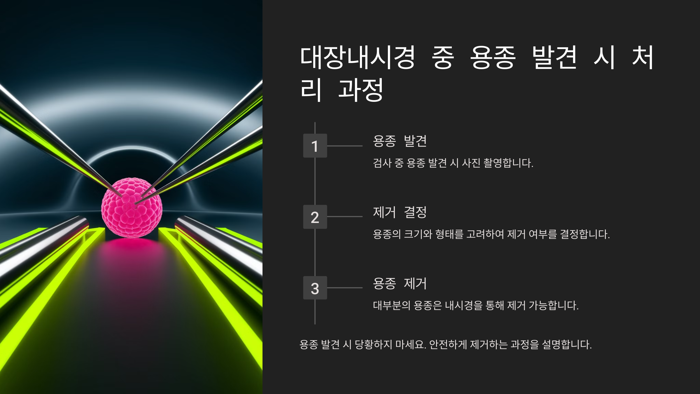 용종이 발견되면 걱정할 수도 있지만, 조기에 제거하면 대부분 문제가 되지 않아요. 특히 선종성 용종은 시간이 지나면 암으로 발전할 위험이 있기 때문에 발견 즉시 제거하는 것이 가장 좋아요!