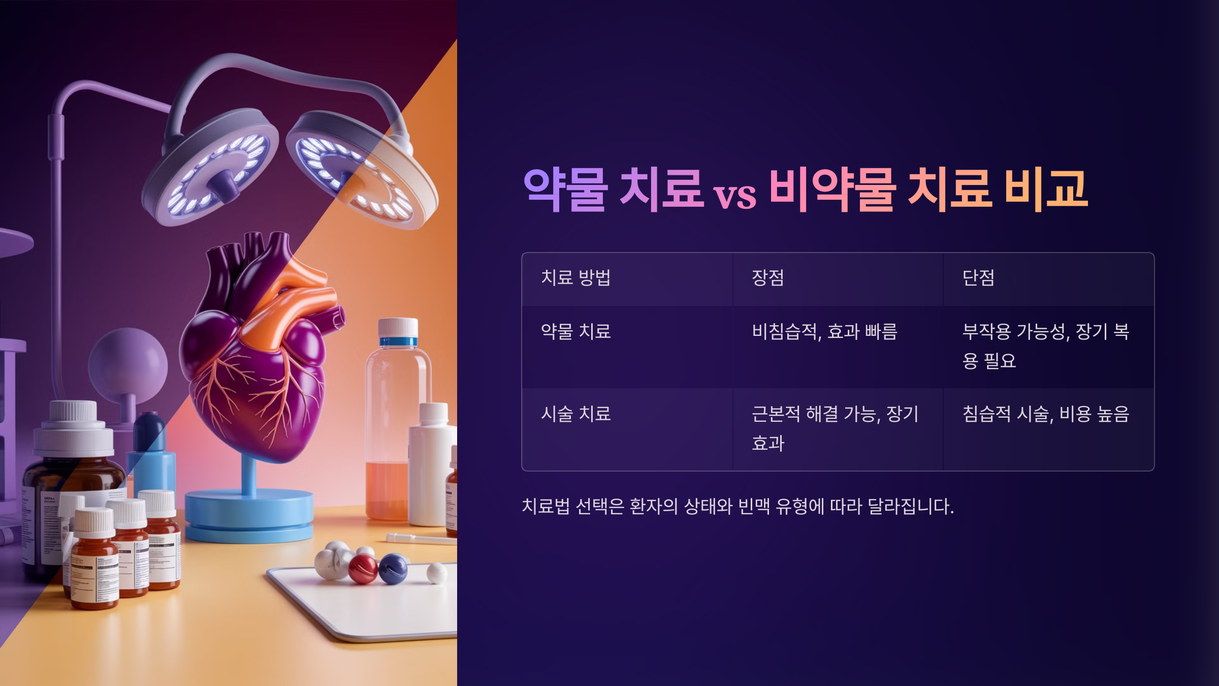 ✔️ 약물 치료: 심박수를 조절하고 부정맥을 예방하기 위해 사용돼요. 베타 차단제, 칼슘 채널 차단제, 항부정맥제 등이 대표적이에요. 장점은 간편하지만, 일부 부작용이 있을 수 있어요.