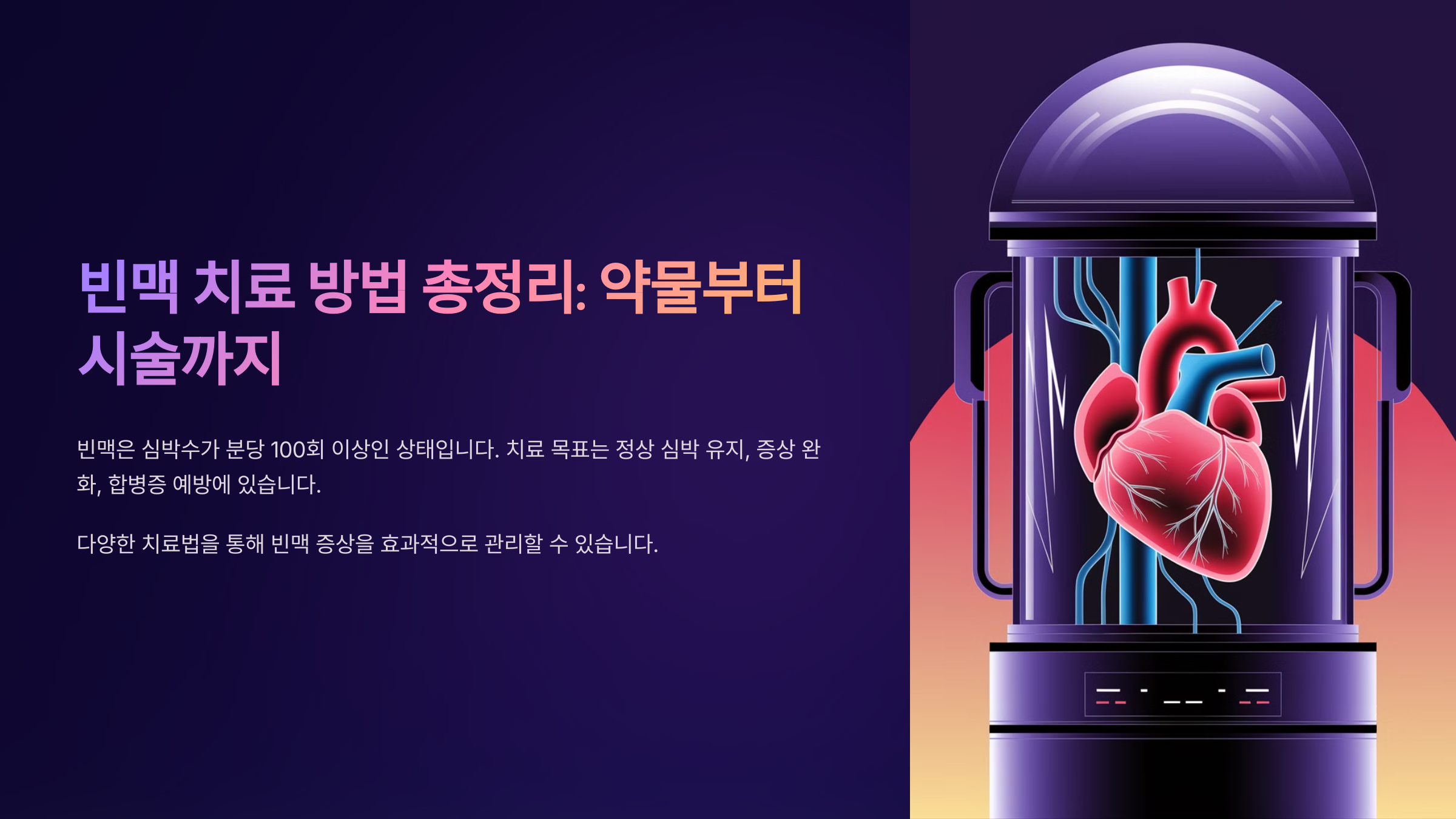이번 글에서는 빈맥 치료에 사용되는 대표적인 약물과 시술 방법을 비롯해, 심박 조절을 위한 생활 습관, 최신 의료기술, 치료 후 관리 방법까지 자세히 살펴볼게요! 🏥