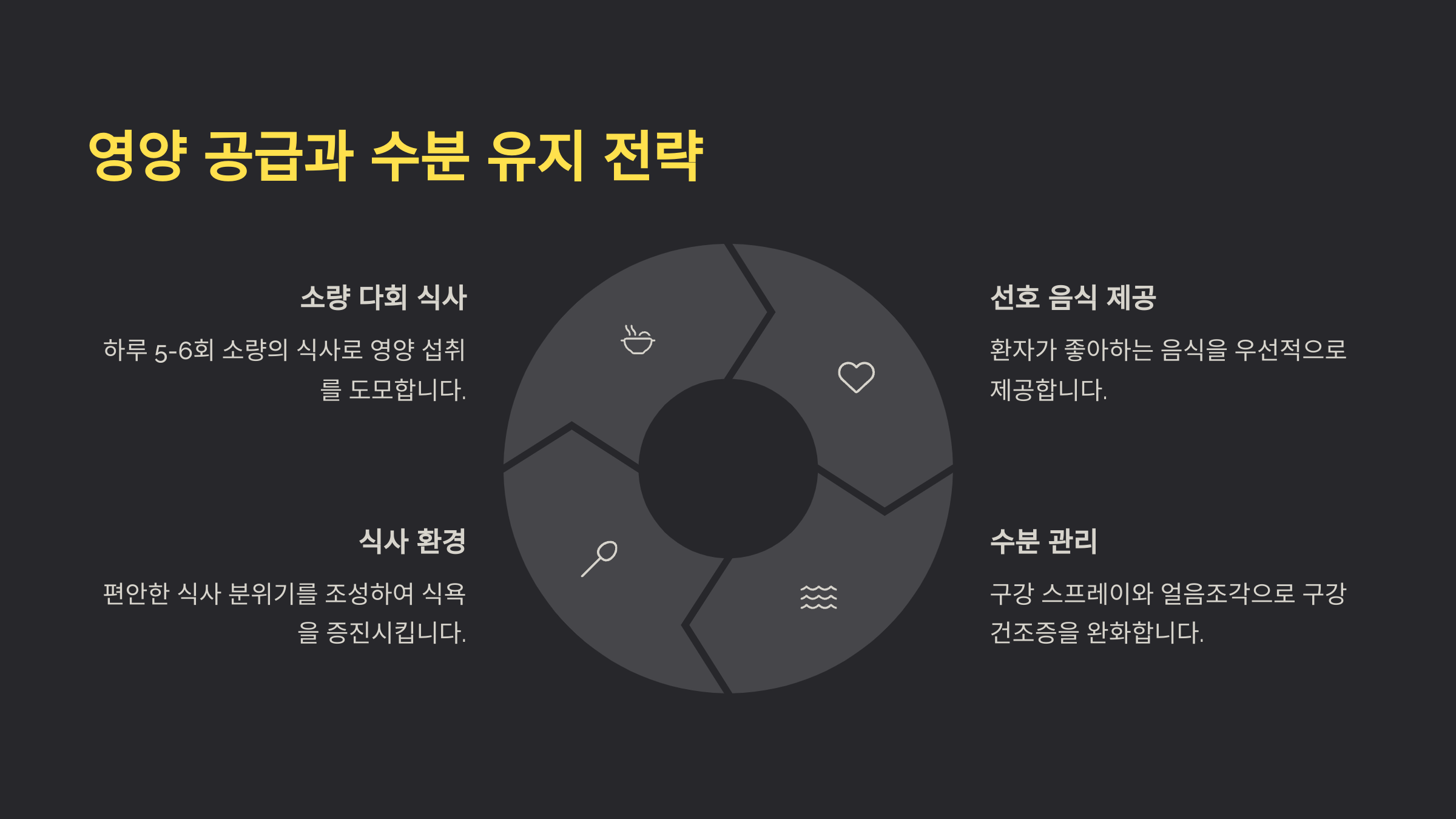A4. 고칼로리, 고단백 식단을 준비하고, 소량씩 자주 먹도록 유도하는 것이 좋아요. 국물, 스무디, 단백질 쉐이크 같은 부드러운 음식도 추천돼요. 🥣