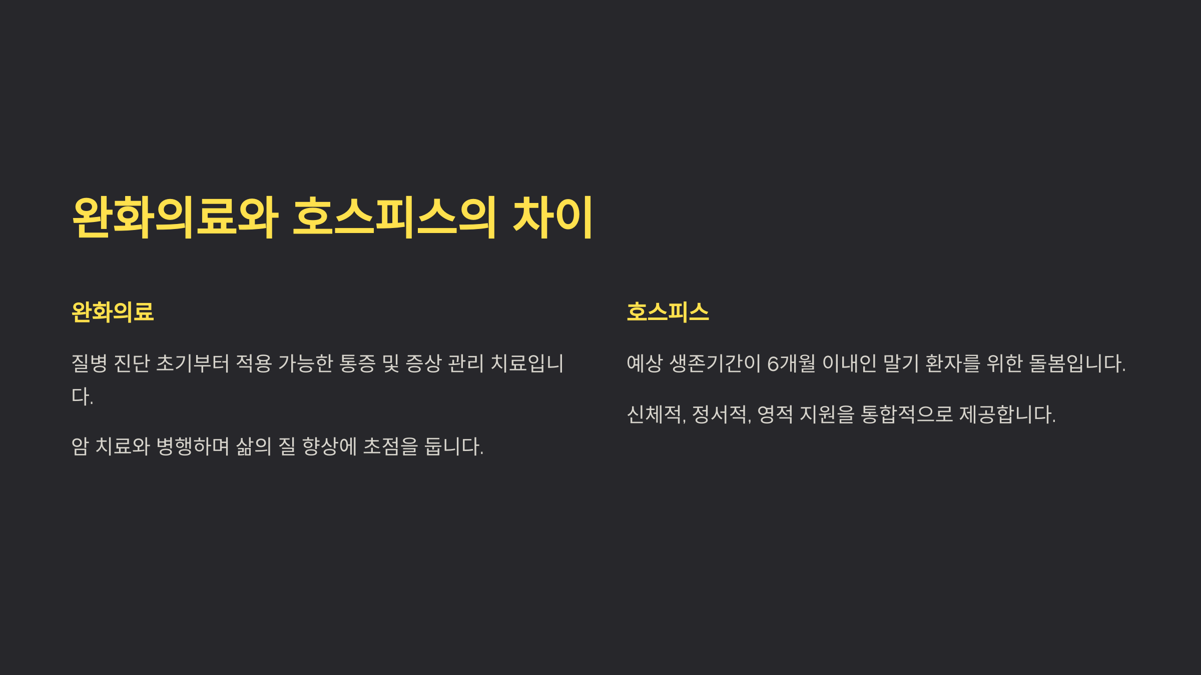 이 차이를 정확히 이해하면, 환자와 가족이 적절한 시기에 필요한 의료 서비스를 받을 수 있어요. 두 서비스 모두 환자의 신체적, 정서적, 영적 안정을 목표로 하지만, 제공 방식과 시점이 다르다는 점을 꼭 기억해야 해요! 😊