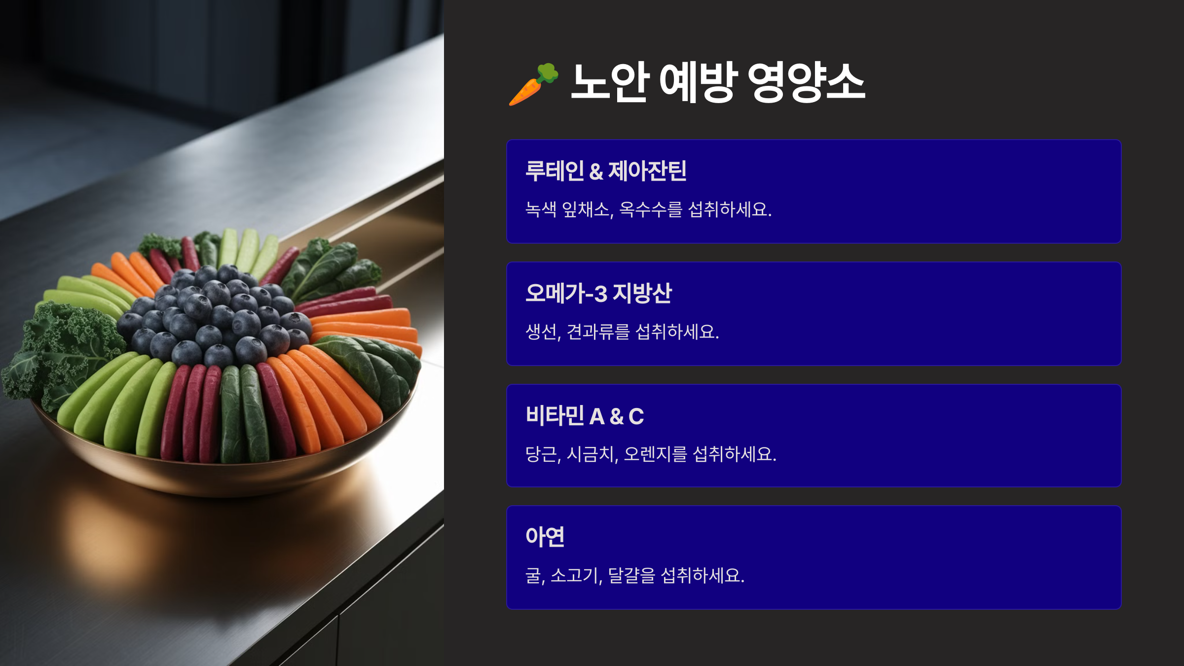 눈 건강을 유지하려면 식습관이 정말 중요해요! 노안을 예방하고 시력을 보호하는 데 도움이 되는 필수 영양소들을 알아볼게요. 🥕🥬