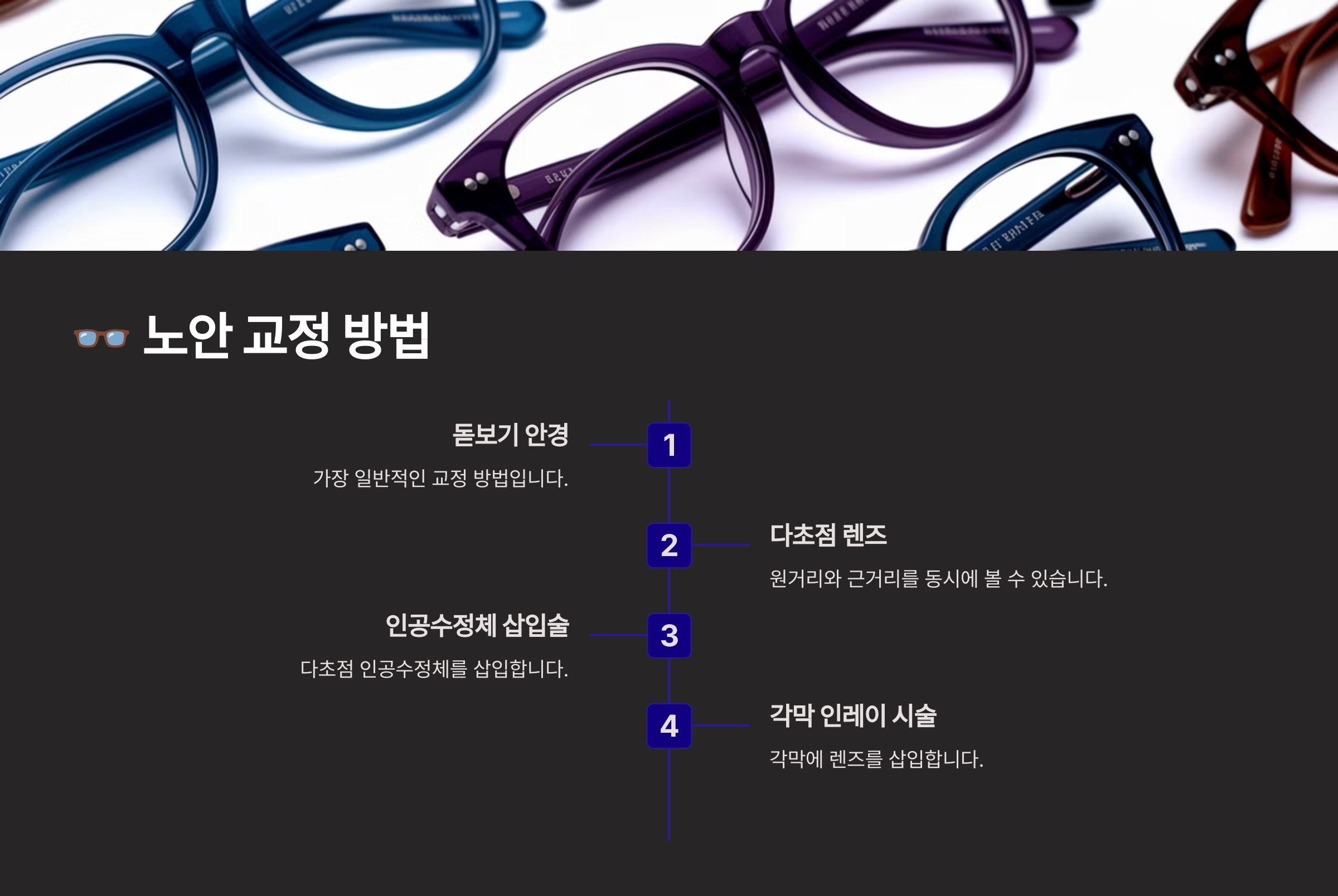 🔽 다음 섹션에서 '노안 교정 방법과 최신 시술'을 알아볼게요!