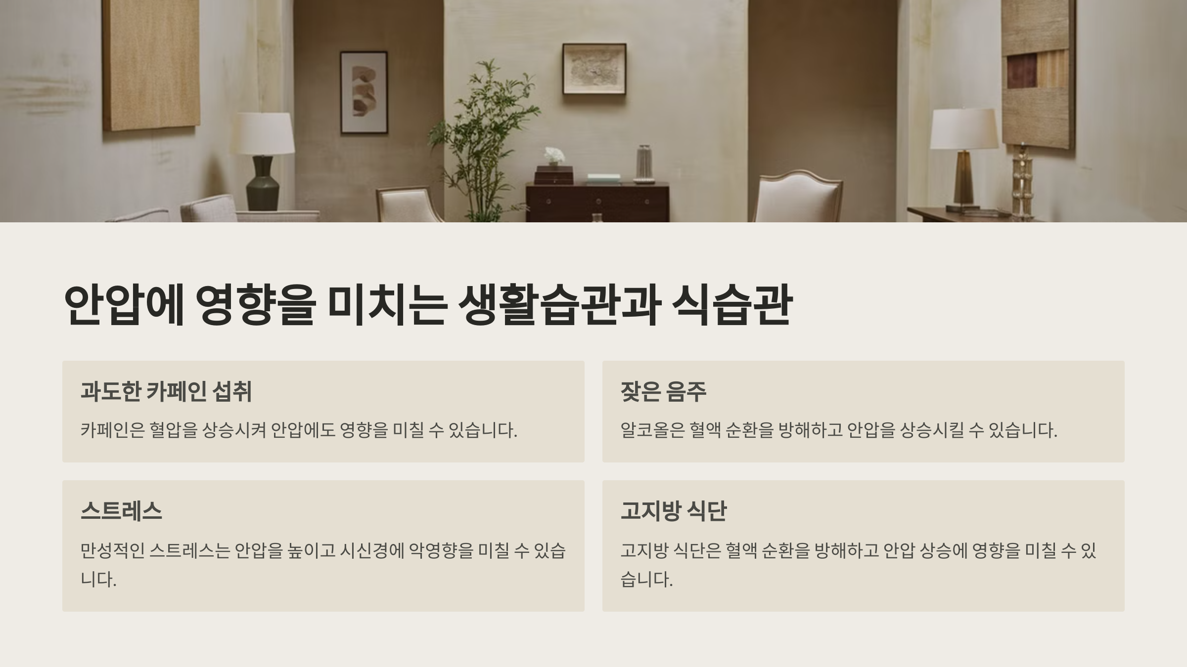 ✅ 4. 스트레스 관리 스트레스는 혈압과 안압을 높이는 원인이 될 수 있어요. 명상, 심호흡, 충분한 수면으로 긴장을 푸는 것이 중요해요.