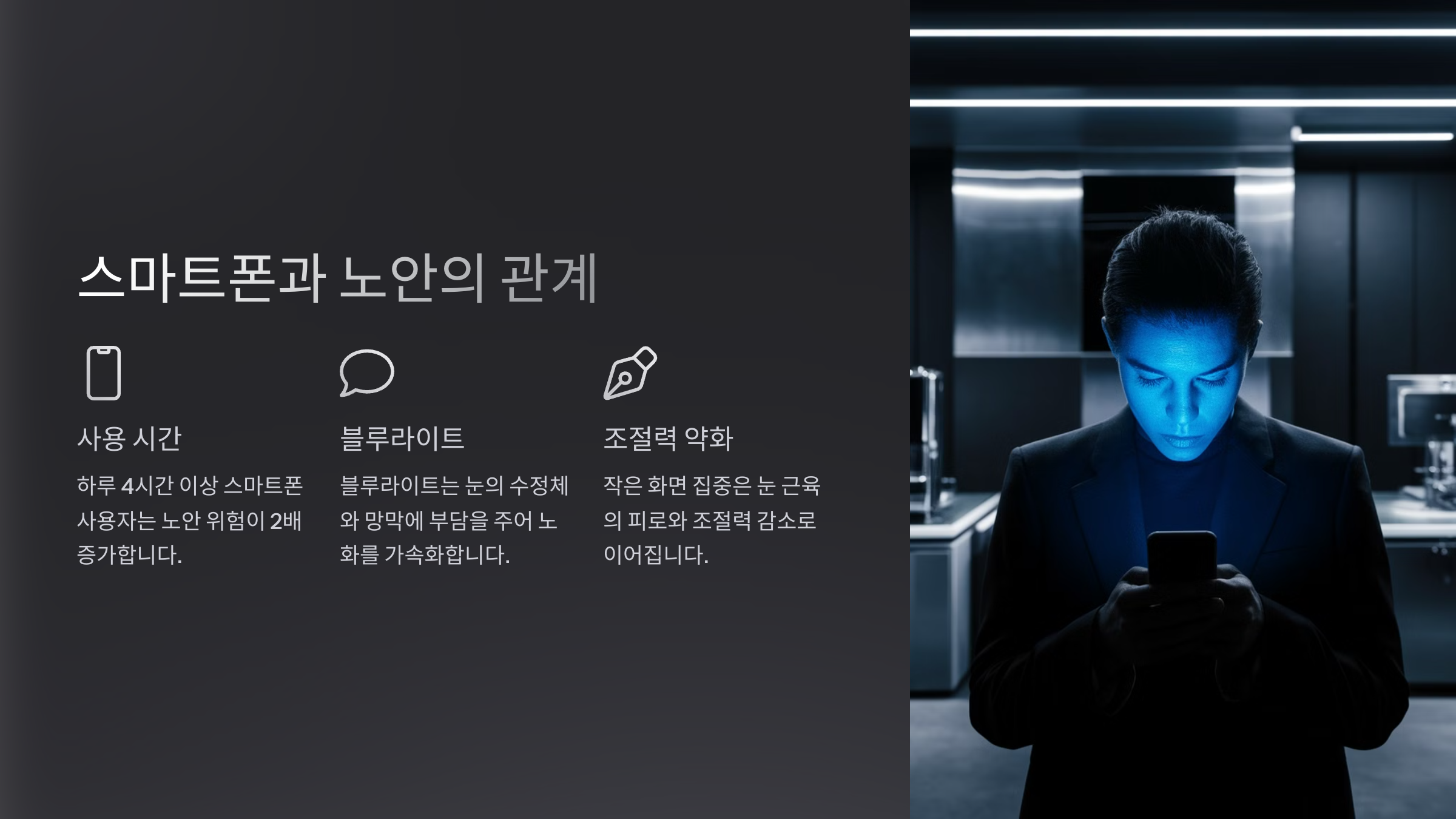특히, 어두운 곳에서 스마트폰을 보면 동공이 더 크게 열리고, 블루라이트에 더 많이 노출되기 때문에 눈의 피로도가 급격히 증가해요. 이로 인해 조기 노안뿐만 아니라 안구건조증, 두통까지 동반될 수 있어요. 🥲