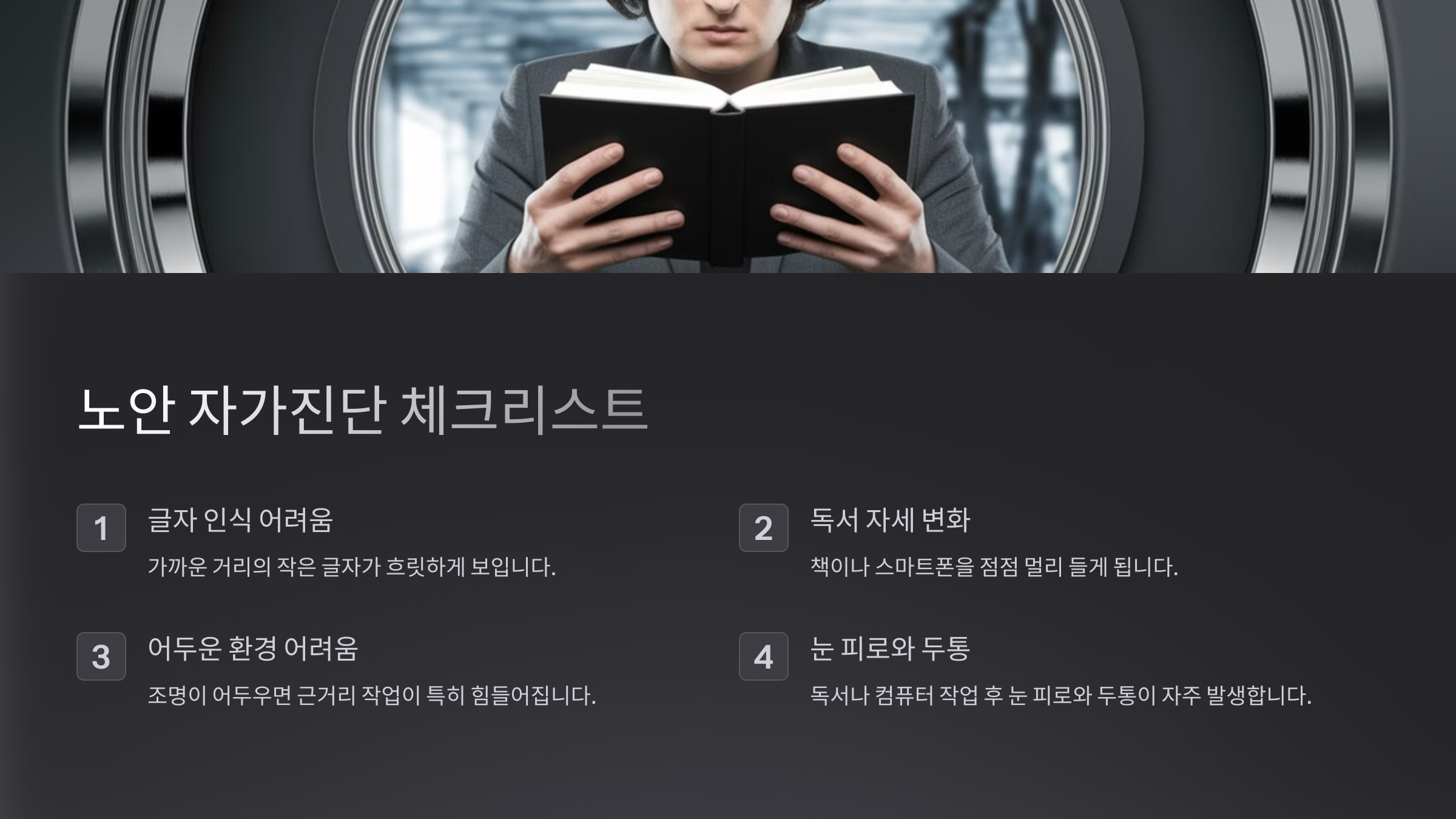 혹시 나도 노안이 시작된 걸까? 가끔 스마트폰 화면이 흐릿하게 보이거나, 책을 읽을 때 초점이 맞지 않는 경험이 있다면 아래 체크리스트를 확인해보세요! ✅