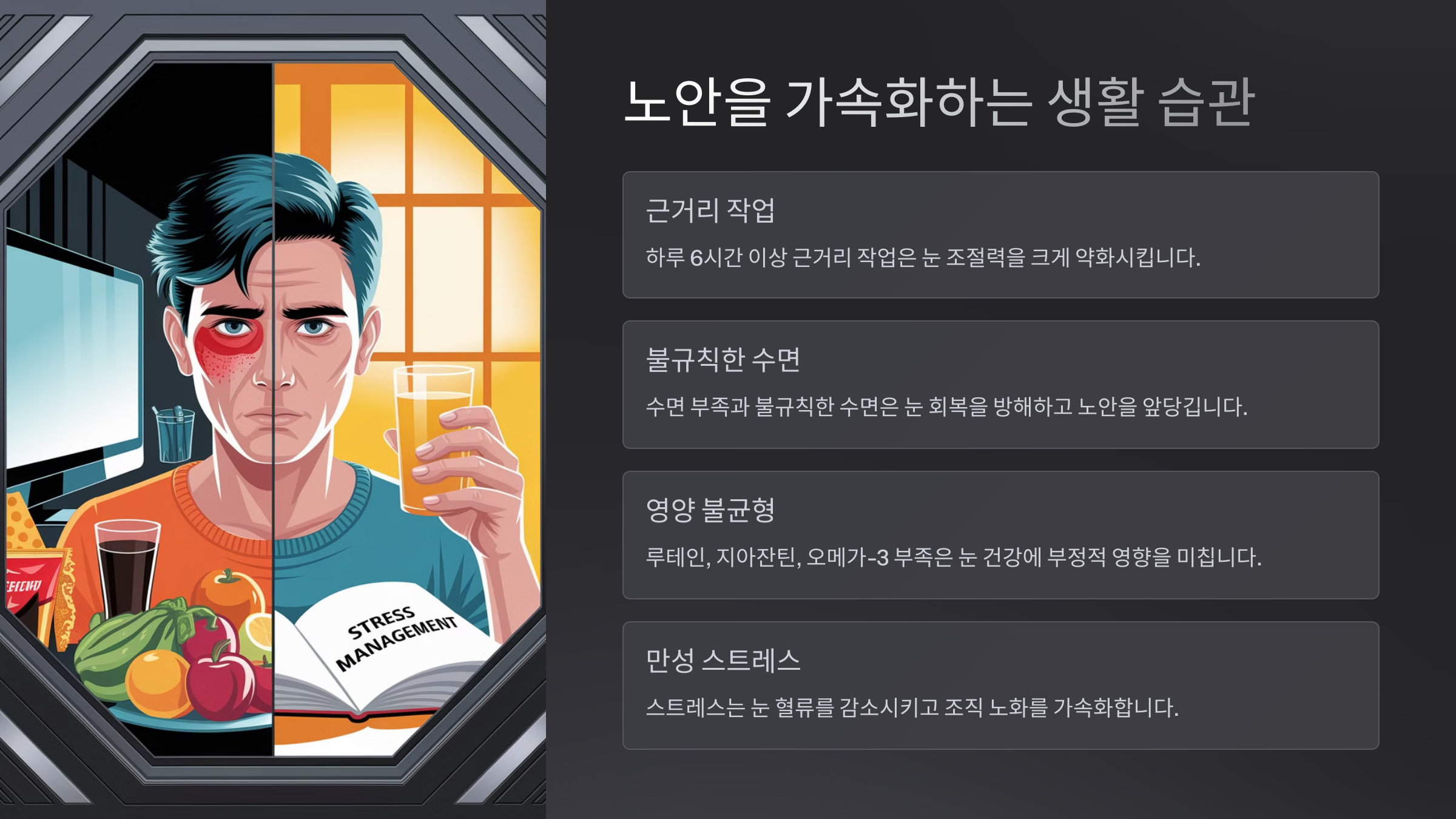 다음으로, 노안을 가속화하는 생활 습관에 대해 알아볼까요? 🚨