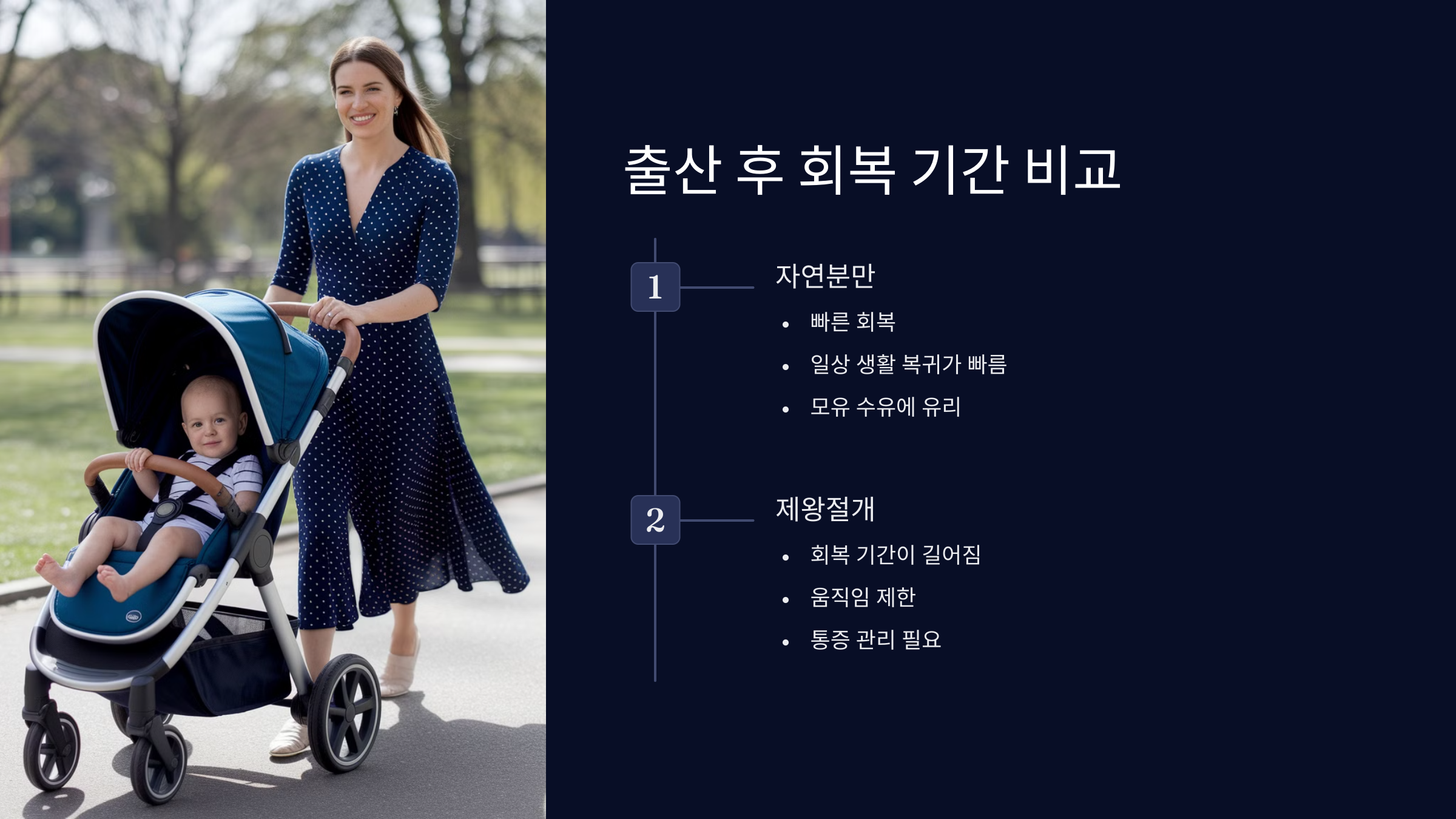 | 자연분만 | 회복 속도가 빠름, 모유 수유에 도움 | 진통이 강함, 출산 과정이 길어질 수 있음 |