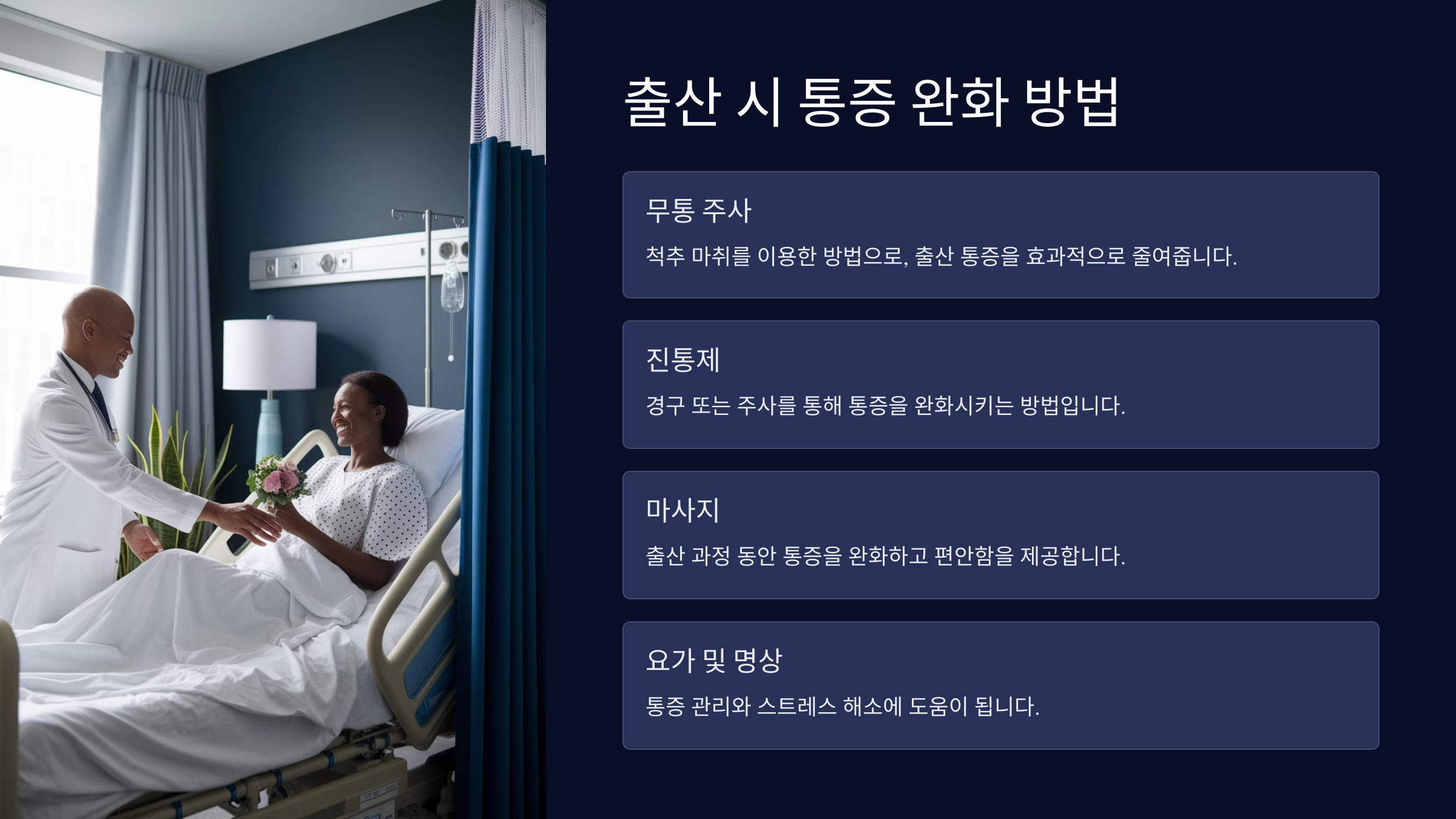 출산은 강한 통증을 동반하지만, 다양한 방법으로 통증을 줄일 수 있어요. 자연적인 방법부터 의학적인 방법까지 선택지가 많아요.