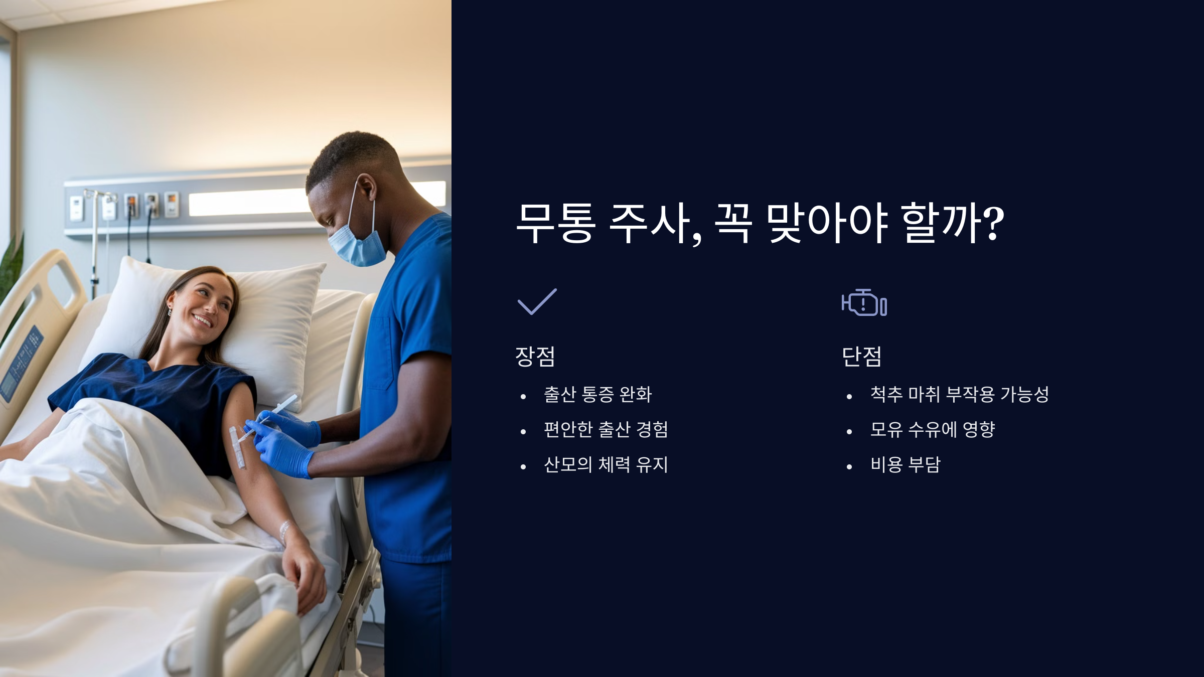| 무통주사 | 경막외 마취로 통증을 크게 줄임 | 출산 시 통증이 거의 없음 | 혈압 저하, 두통 등의 부작용 가능 |