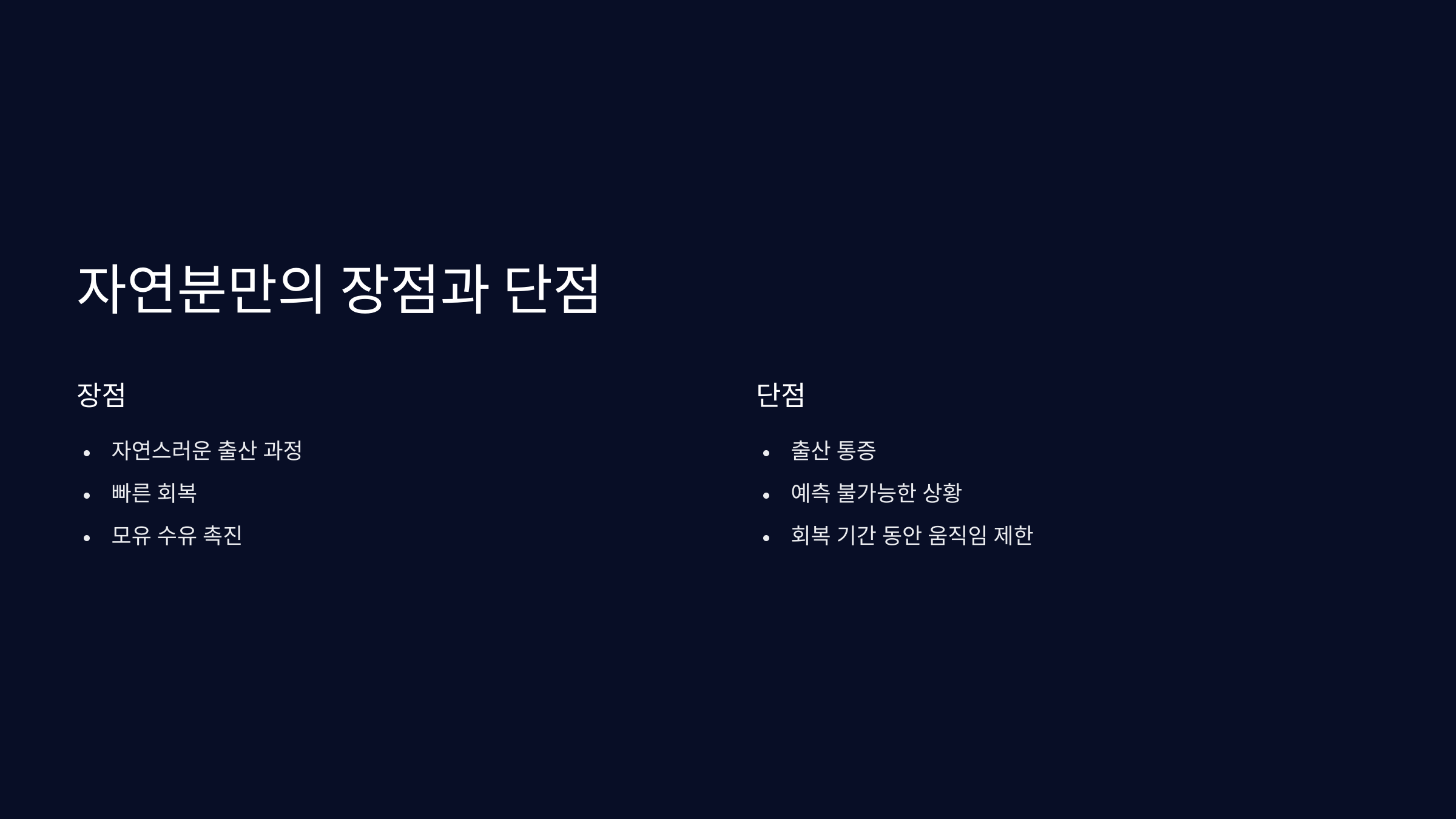 | 자연분만 | 회복 속도가 빠름, 모유 수유에 도움 | 진통이 강함, 출산 과정이 길어질 수 있음 |