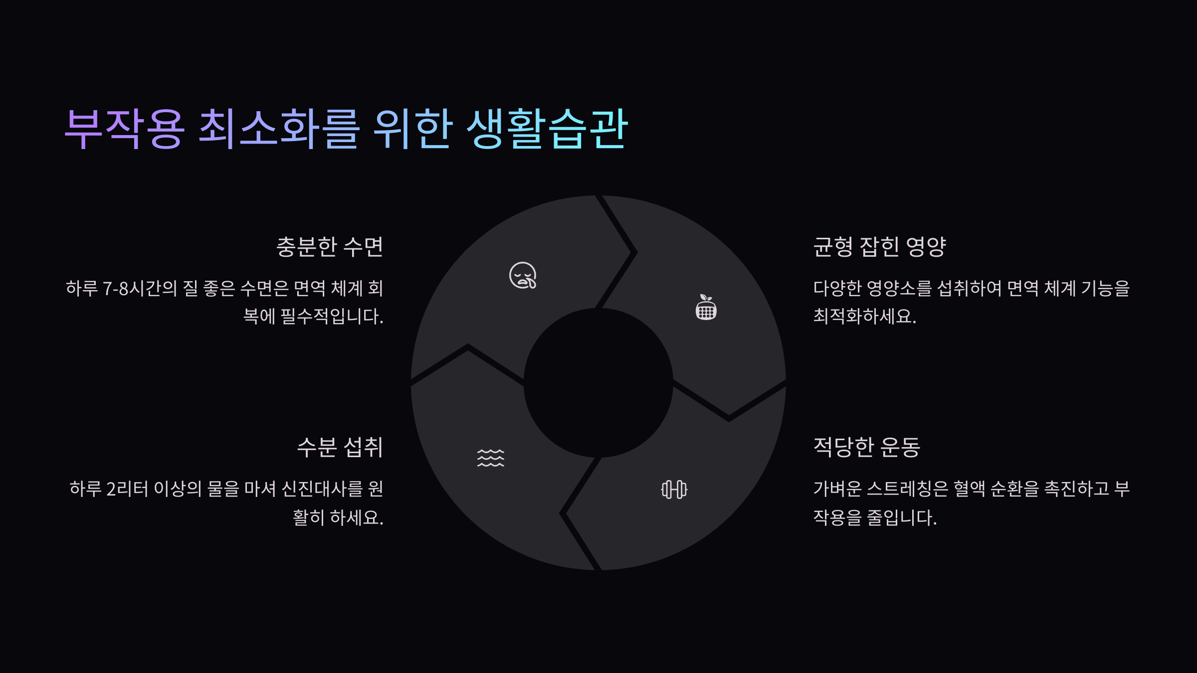 • 스트레스 관리: 스트레스가 많으면 면역력이 떨어지므로 명상이나 취미 활동이 도움이 돼요.