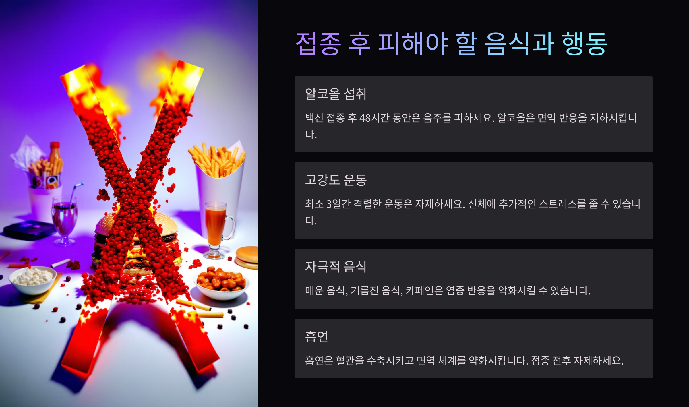 백신 접종 후에는 몸이 예민해질 수 있기 때문에, 자극적인 음식보다는 균형 잡힌 식단을 유지하는 것이 중요해요. 이제 접종 후 피해야 할 음식과 행동에 대해 알아볼게요! 🚫