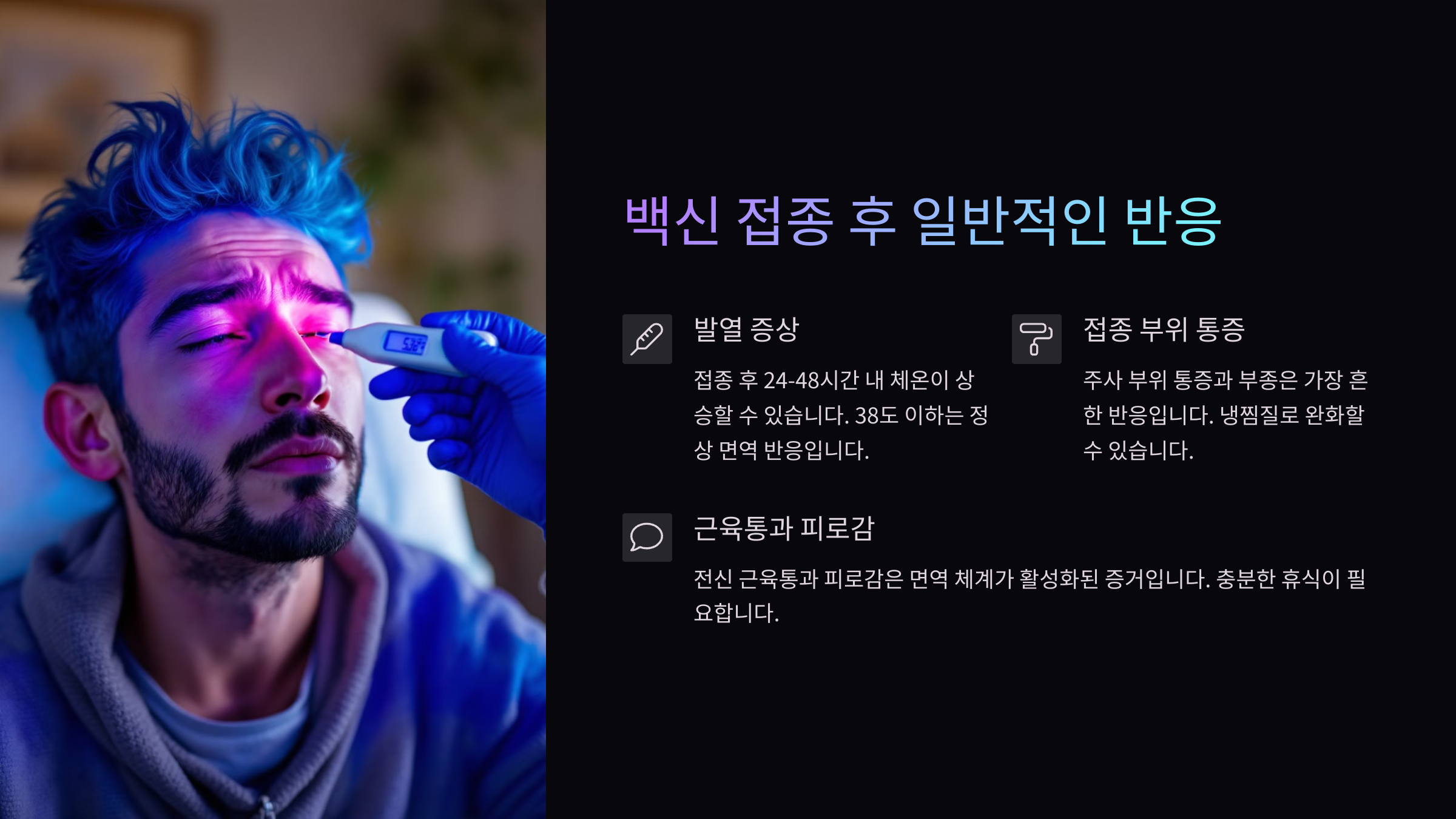 - 발열: 38도 이하의 열은 정상적인 면역 반응이에요. 충분한 수분을 섭취하고, 해열제를 복용하면 도움이 돼요.