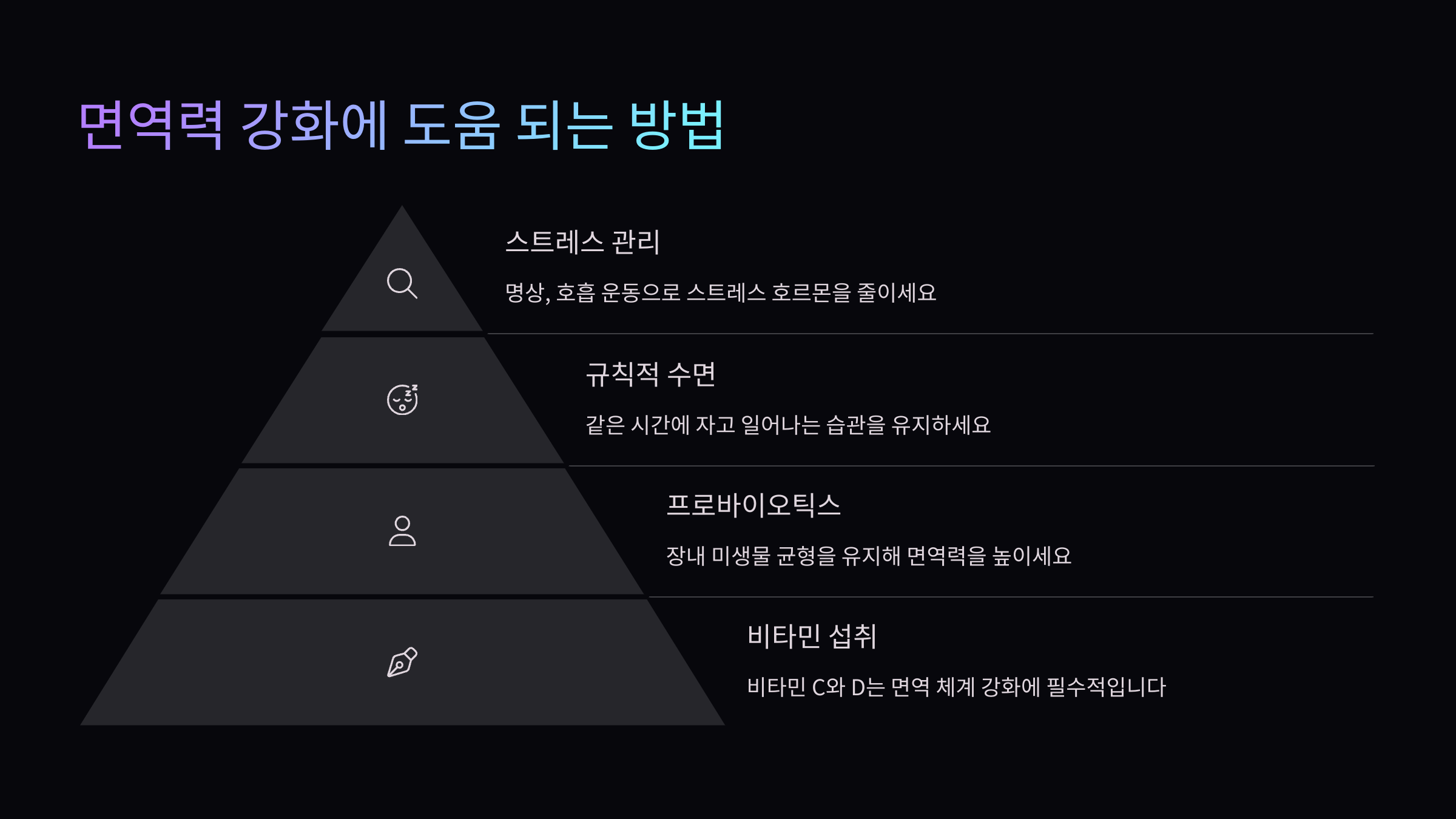 - 스트레스 관리: 스트레스가 많으면 면역력이 떨어지므로 명상이나 취미 활동이 도움이 돼요.