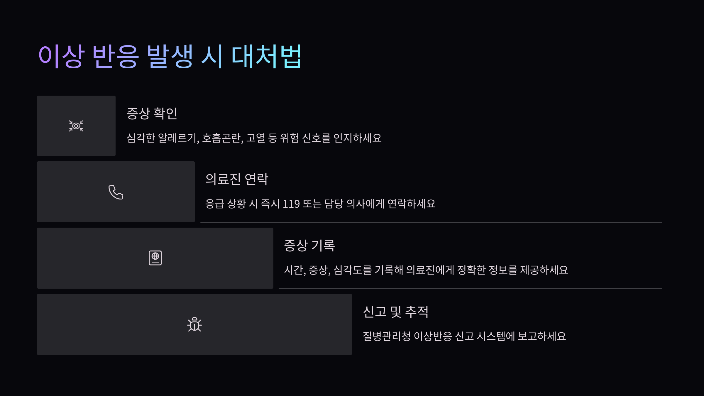 | 호흡 곤란, 가슴 통증 | 즉시 119 신고 | 아나필락시스 가능성 있음 |
