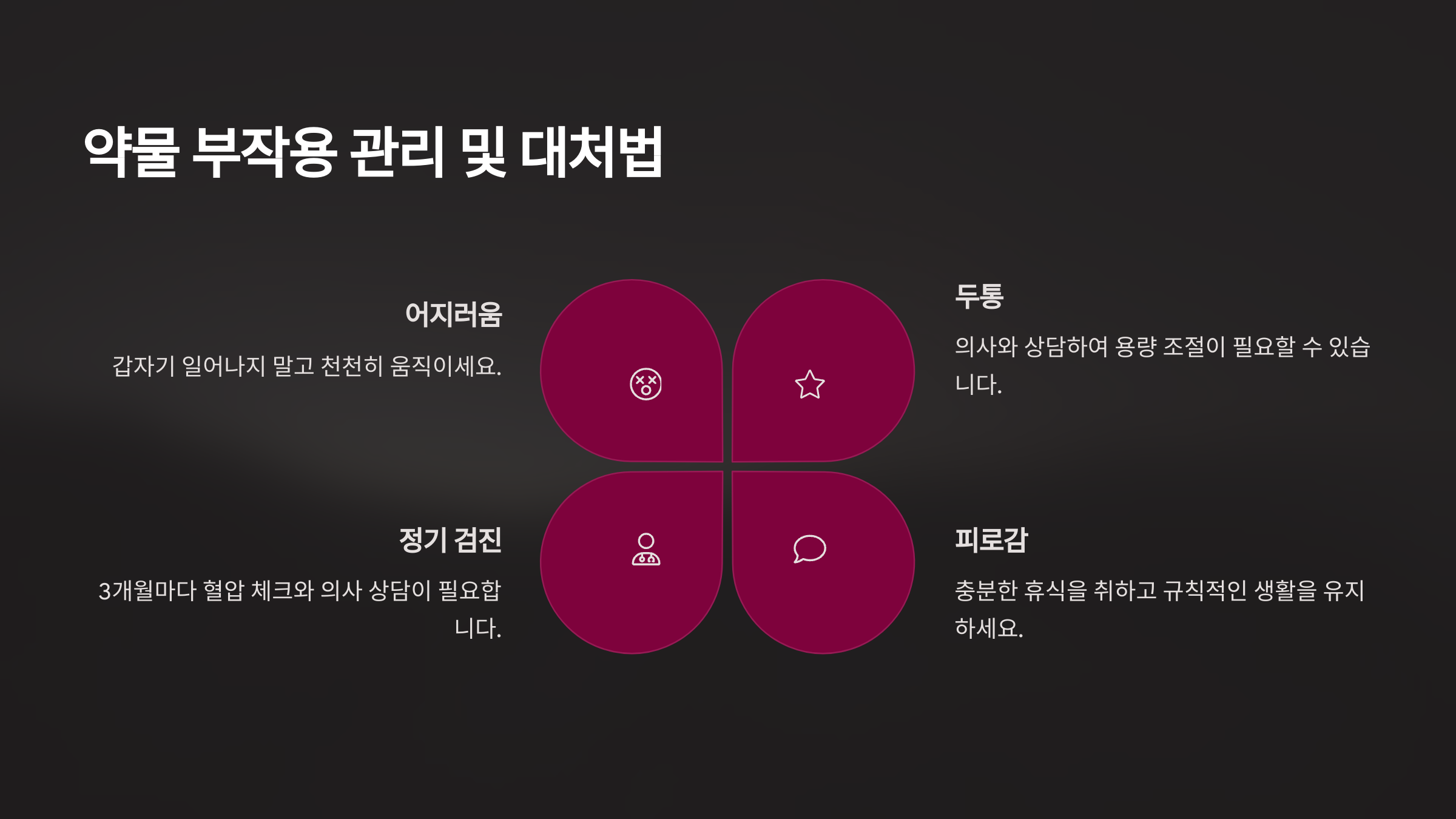 고혈압 약은 오랫동안 복용해야 하는 경우가 많아서, 부작용이 나타날 수 있어요. 대부분 경미하지만 사람에 따라 불편하게 느껴질 수 있고, 간혹 치료가 필요한 수준의 증상이 생기기도 해요.